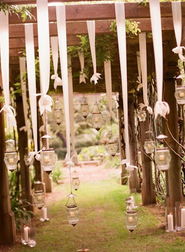 La idea de decorar con velas siempre es acertada y en una boda de tarde-noche todavía más. Las velas ofrecen infinidad de posibilidades decorativas pero hoy me voy a centrar en las velas colgantes que suelen dar mucho juego ya que permiten distintas ubicaciones, podéis utilizarlas para enmarcar la ceremonia, para destacar una zona especial, dar intimidad a un pequeño rincón o como iluminación decorativa de las mesas, lo que dará al momento de la cena un aire más íntimo y romántico. No es necesario recargar la decoración para conseguir un efecto natural, basta con un simple tarrito de cristal y una vela de té. Los tarritos podéis decorarlos o bien dejarlos tal cual pero siempre deberéis tener en cuenta que se han de colgar, por lo que si llevan algún tipo de asa mucho mejor, si no la llevan tampoco es mucho problema porque podéis hacérsela vosotras mismas con ayuda de cuerda, cinta o alambre. A mí me encanta cenar a la luz de las velas, además todo son ventajas porque además de ser una decoración súper económica podéis llevar luz a sitios insospechados donde puede que ni llegue la electricidad, como un jardín o una pradera, el efecto que se crea bajo los árboles es espectacular. Eso sí, si utilizáis las velas al aire libre aseguraos siempre de que el recipiente donde las vais a colocar es suficientemente alto como para que el aire no las apague.