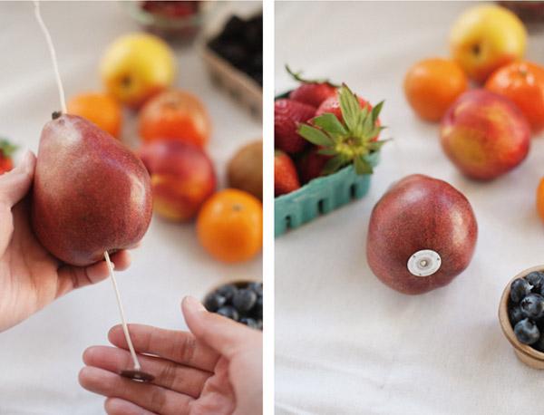 4. Repetir la operación con el resto de frutas y dejar algunas de ellas sin mecha para acompañar la decoración.