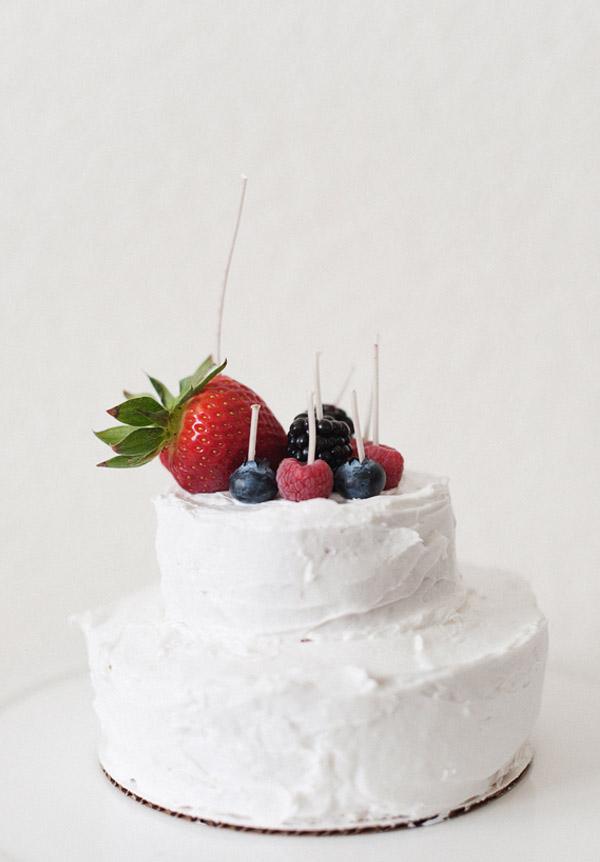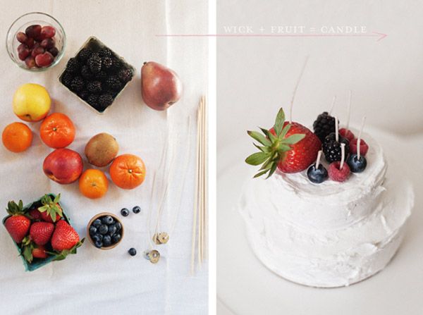 Hoy os traigo una idea facilísima de hacer y que puede quedar muy bonita a la hora de decorar el pastel de vuestra boda o cualquier pastel de cumpleaños. Se trata de crear vuestras propias velas con frutas naturales. Podéis elegirlas en función de la época del año, de vuestros gustos personales o según vuestros sabores favoritos. Eso sí, os recomiendo que las escojáis de distintos tamaños y formas pero siempre en función del tipo de pastel que vayáis a servir. Según cómo las decoréis pueden llegar incluso a sustituir el típico cake topper, hay muchos novios a los que no les gusta poner sobre su pastel de bodas ninguna figurita pero sí algún adorno más natural y si además el día de la boda es el cumpleaños de alguno de los dos la idea ya os va como anillo al dedo. Vais a necesitar: variedad de frutas de diferentes tamaños, brochetas de madera, mechas de velas y tijeras.