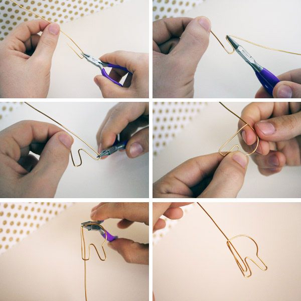 Cortar un trozo de alambre de unos 20 cms. más o menos, en función de la forma elegida. Empezar a doblar el alambre de forma que coincida con los ángulos de las formas dibujadas. Para curvas cerradas y bordes puedes ayudarte de los alicates, para curvas más flexibles basta doblarlas con ayuda de los dedos. Cada una de las formas debe terminar con un óvalo alargado, ya que es lo que mantendrá el clip perfectamente sujeto al papel.