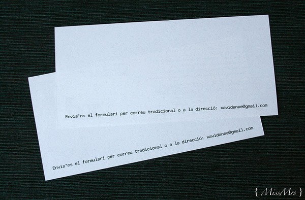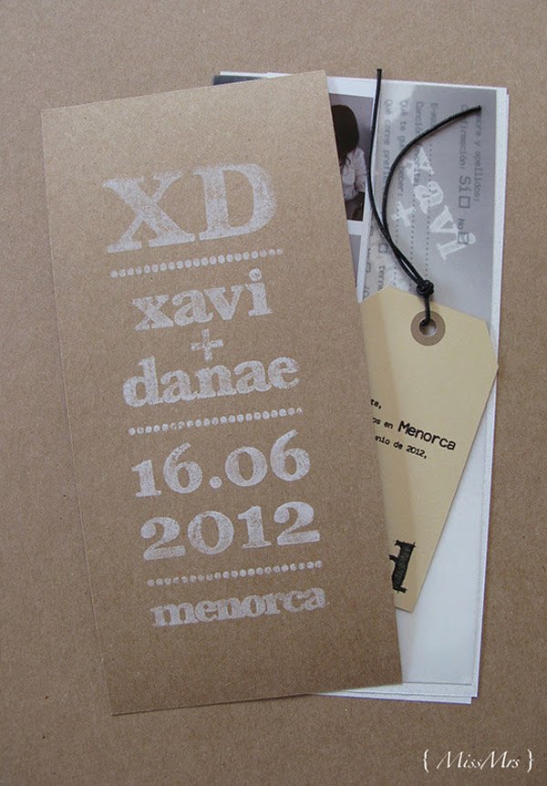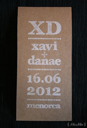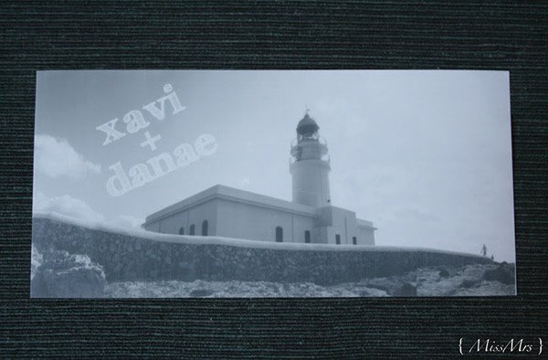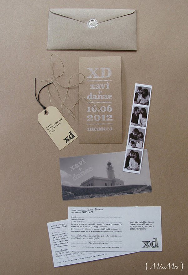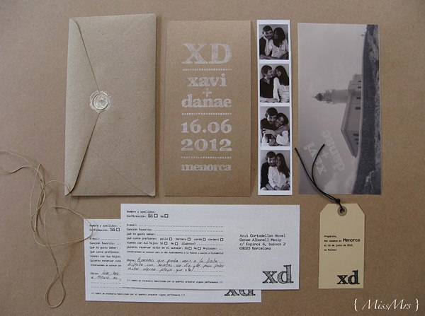 Gracias al blog y al mundo 2.0 estoy conociendo muchísima gente nueva con la que comparto un montón de cosas, desde inquietudes similares hasta ilusiones por un trabajo común, risas, cenas con amigo invisible incluido y hasta alguna escapada de fin de semana. En uno de estos encuentros conocí a Danae. Empezamos nuestra relación en twitter y a través del blog y tuvimos la ocasión de ‘desvirtualizarnos’ con motivo del primer encuentro de ‘When Love Meets Blog’, donde además nos tocó compartir habitación con Greta de Wedding Senses, un encanto de persona. Pues bien, del trabajo de Danae ya conocía algo a través de sus blogs { MissMrs } y My place by Danae, ella es interiorista y diseñadora y, junto con su madre que es asesora de moda, se dedican a la organización de bodas y eventos. Danae es una de las bloggers de bodas que se casa este año, junto con Sara, colaboradora de Quiero una boda perfecta y Marina de Fuxia Atelier, así que en el mundo bloggerbodil estamos todas como locas siguiendo todos sus preparativos, ideas y planes, es como si todas nosotras volviéramos a casarnos de nuevo. Pero no me disperso porque hoy os quiero hablar de Danae y concretamente de sus invitaciones de boda. Sólo con verlas ya podéis intuir un reflejo de su personalidad, sencilla, elegante, discreta y original. A mí me han encantado porque, además de tener muchísimo mérito por haberlas hecho los mismos novios, dicen mucho de lo que será su boda. Las invitaciones están compuestas de varios elementos: un sobre de papel reciclado con el nombre del invitado escrito en rotulador blanco y sellado con lacre del mismo color, una tarjeta de cartulina kraft con un texto estampado con un sello de goma, una etiqueta con algunos detalles de la boda, una tira de fotos en blanco y negro de los novios, una foto de su faro favorito de Menorca (localidad donde se casarán) en papel vegetal y un formulario que los invitados tienen que rellenar. Todo atado con un cordel de embalaje. A mí me ha gustado mucho el detalle de la foto del Far de Cavallería, ya que tiene un trasfondo muy sentimental porque fue tomada por los mismos novios el primer verano que pasaron juntos en la isla, ¿no os parece romántico? Si queréis saber más sobre cómo se hicieron las invitaciones podéis visitar el blog de Danae en este enlace. ¡Seguro que os encantan!