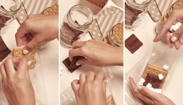 1. Coger una de las bolsitas transparentes y meter en su interior una pieza de chocolate, una galleta y varias nubes de algodón.