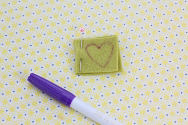 Corta dos cuadrados pequeños de fieltro y sujétalos con un alfiler para que no se muevan. Pinta en el centro un corazón con ayuda del rotulador.