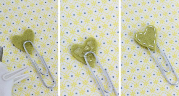 Pega los corazones en el clip con pegamento o cola caliente. Pon primero un poco de pegamento en el centro del corazón que no va cosido y en el clip, colocando encima el corazón cosido y presionando con cuidado para que quede bien sujeto pero sin apretar en exceso, ya que en este caso se saldría el pegamento por los lados y el clip se marcaría demasiado en el fieltro.