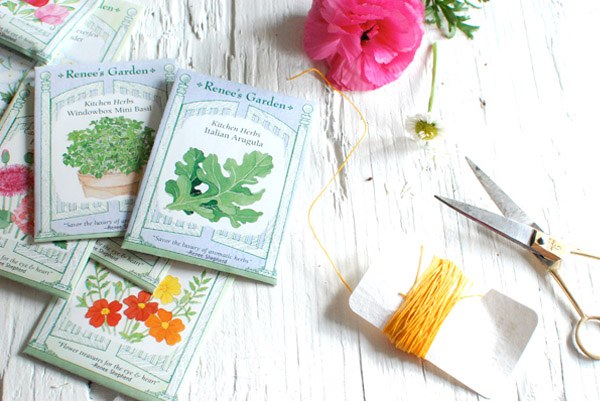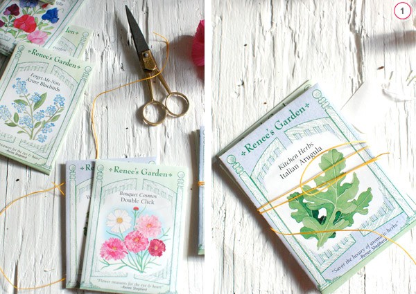 Vais a necesitar: Paquetitos de semillas con impresión vintage, hilo de diferentes colores, etiquetas blancas, pluma y tijeras.