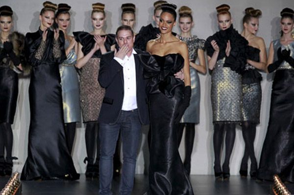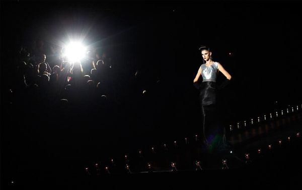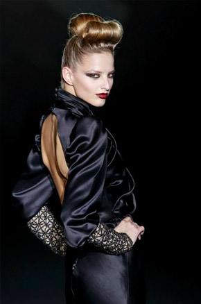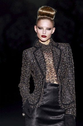 Sí, este fin de semana hemos estado en la CMFSW invitados por el diseñador Hannibal Laguna. Asistimos a su desfile y a la presentación de la nueva colección HIT para Otoño-Invierno 2011-2012. Hannibal ha sido fiel a su estilo y su propuesta para la próxima temporada tiene como protagonista el negro. La colección es elegante, sofisticada y glamourosa, con propuestas en nude y en plata brillante pero dejando paso abierto al negro, combinado en ocasiones con apliques y detalles dorados y plateados. Modelos pensados para estar siempre de fiesta, tipo cocktail y también largos, asimétricos, de corte sirena y faldas lápiz, con mezcla de tejidos, leves plisados, bordados y redes de seda, chalecos de pelo en tonos oscuros y zapatos de difícil cuña en terciopelo negro. Impresionante el pase-actuación final de Godeliv, su musa modelo, con un diseño inspirado en el pez manta raya, toda una demostración de clase, estilo y glamour bajo la eterna imagen de la Torre Eiffel iluminada como fondo de pasarela. Un viaje imaginario por el femenino y rotundo hit style de la firma.