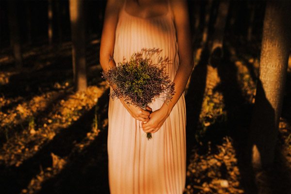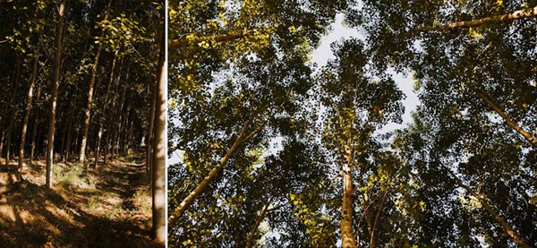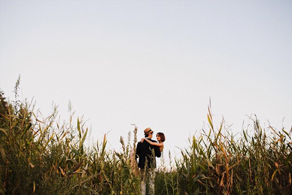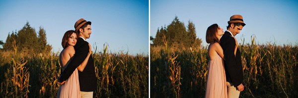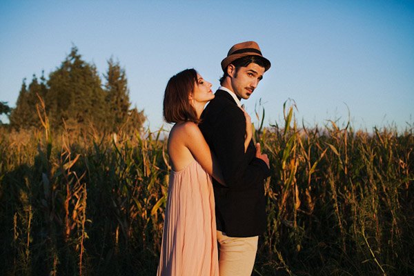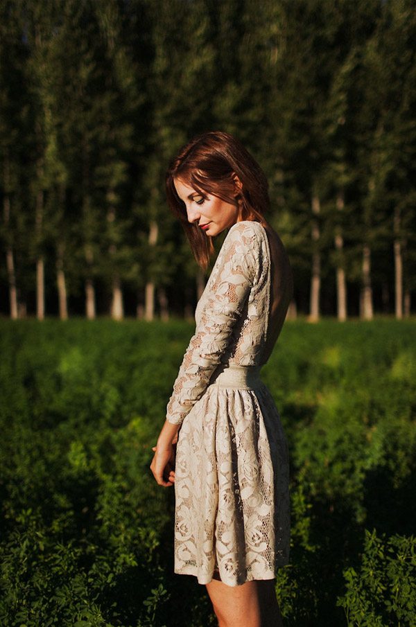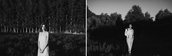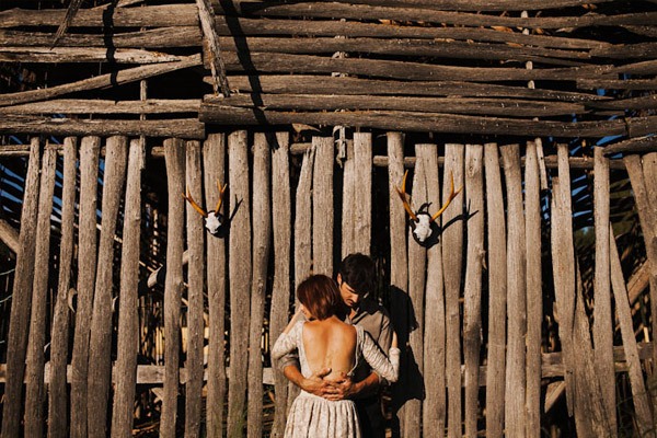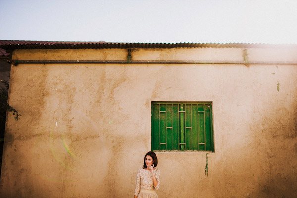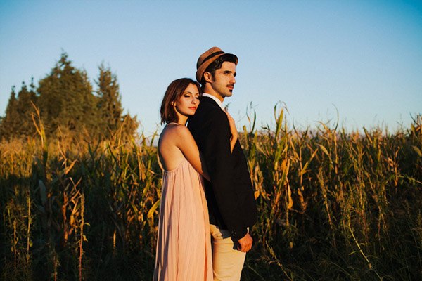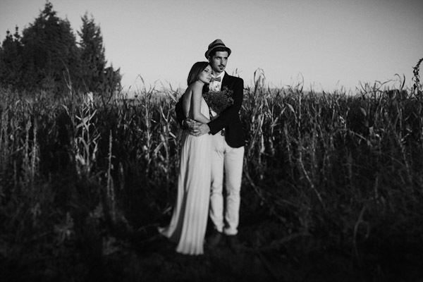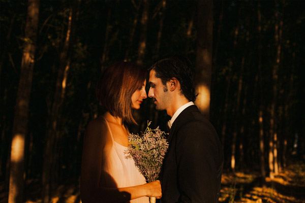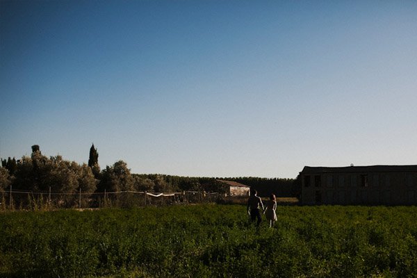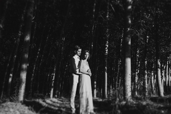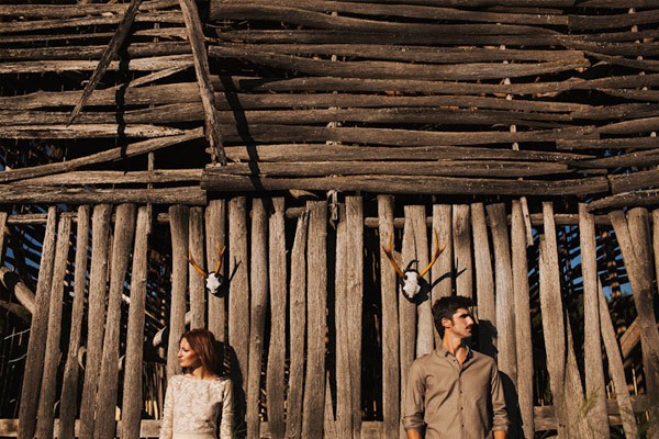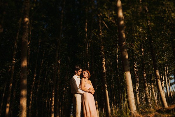 Hay fotografías que cuando las ves por primera vez sin saber por qué transmiten sensaciones, estados emocionales, no sé si a vosotros os sucede pero a mí me pasa muchas veces. De repente abro un mail o me encuentro con un reportaje y me quedo como atrapada en la imagen, es una sensación extraña sentir como si la fotografía te hablase o te estuviera queriendo contar algo o llevarte a aquel lugar. Eso me sucedió cuando recibí un mail con la sesión de fotos que hoy os traigo, la de Ana y Lucas. No sé si es por la luz, que creo que se debe en gran parte a ello, pero todo el entorno en sí transmite como un halo de misterio que se mueve entre lo irreal y lo bucólico. La sesión se realizó en Granada, en un lugar con mucha historia, la zona de la Vega Granadina, en unas casetas que antiguamente eran secaderos de Tabaco y que en la actualidad se encuentran semiabandonados. Estar allí es como trasladarse en el tiempo y revivir los duros trabajos que allí se realizaban. Los novios querían un lugar con personalidad, con fuerza, con historia y lo encontraron. La segunda parte de la sesión estuvo rodeada de misteriosos bosques con árboles frondosos, como ya os he dicho antes, parte de la magia de las fotografías es la luz que hay en ese enigmático lugar, con reflejos verdosos bañados por un haz de luz dorada que parece salir directamente de la superficie solar y que se llega a colar incluso en las instantáneas en blanco y negro. El estilismo fue cosa de los novios, ambos querían algo sencillo, elegante y que a la vez rompiera con la naturaleza del propio lugar. Una estética muy lograda con un punto vintage y detalles como el sombrero de Lucas, la imagen de la cámara retro de Súper 8 o el cambio de vestido de Ana dejando ver un impresionante escote de espalda, consiguieron que la sesión fuera más impactante visualmente y que el entorno quedase totalmente a disposición del objetivo del fotógrafo.