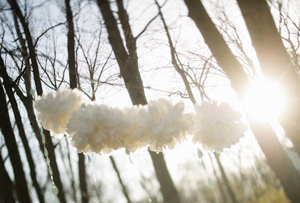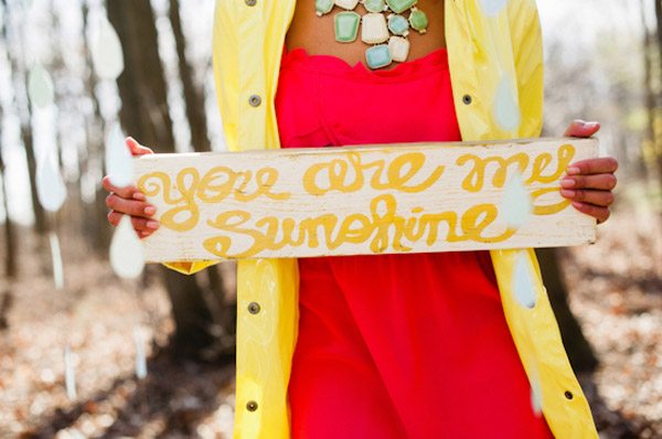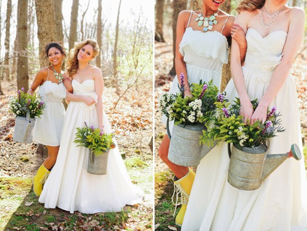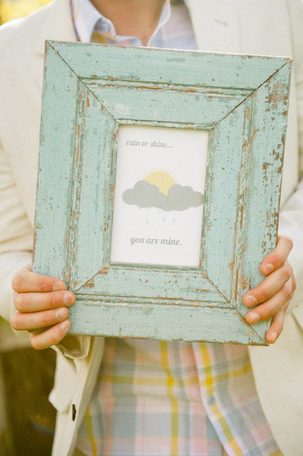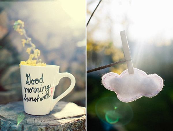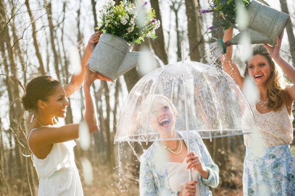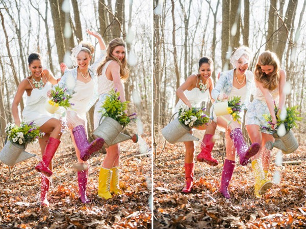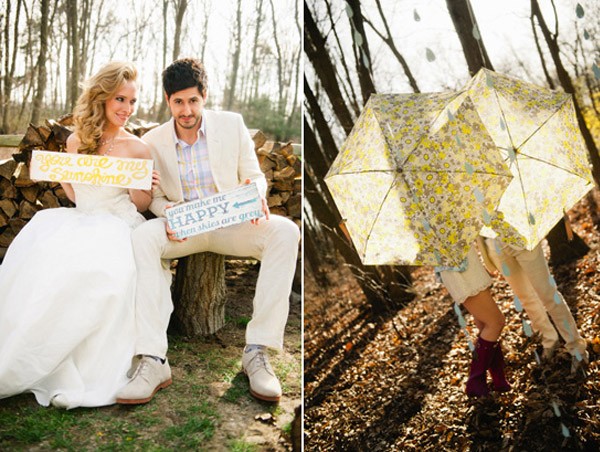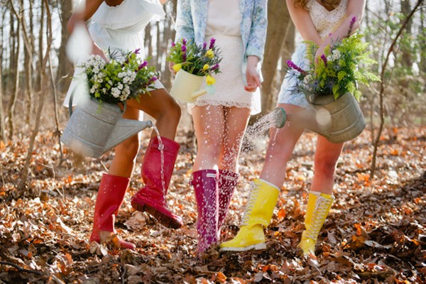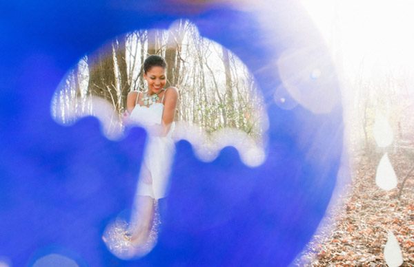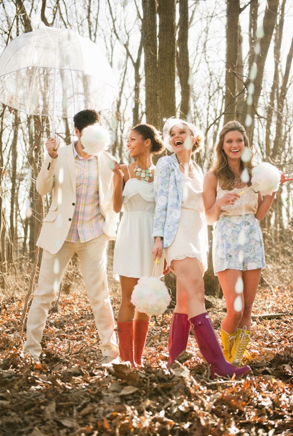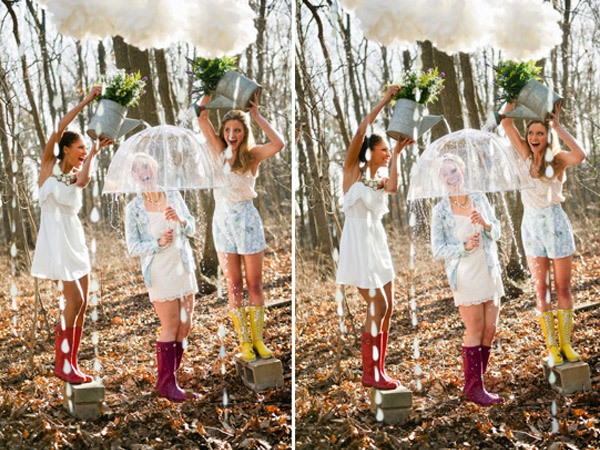 La verdad es que este mes de abril está haciendo honor al dicho y cada mañana, cuando me levanto, lo primero que hago es mirar por la ventana para ver qué tiempo hace. Hoy, como ayer, el cielo ha amanecido nublado y las previsiones para mañana parece que no mejoran. En un mes como este, que ya empiezan a sonar campanas de boda por las iglesias y juzgados, no puedo evitar pensar en la novia que a un día de su boda no deja de mirar al cielo temiendo que la lluvia caiga sin piedad sobre su día más soñado. Pero como soy de las que siempre ve el vaso medio lleno, pienso que hay que darle la vuelta a las situaciones inesperadas y enfrentarse a ellas con una sonrisa. El post de hoy va precisamente de eso, de la combinación imperfecta de lluvia y boda. Se trata de un reportaje muy divertido donde las nubes de algodón, las botas de agua y las guirnaldas de gotas de lluvia, son las protagonistas. Me he divertido mucho viendo las fotografías y por las caras de sus protagonistas me huelo que ellos también. No os perdáis ningún detalle porque el ‘mal tiempo’ está presente de principio a fin, en las invitaciones, en los ramos de la novia y sus damas de honor con forma de gran nube de algodón de colores, en el pastel nupcial, en las guirnaldas con pompones blancos o en las nubes de las cañitas de los refrescos… ¡hasta el florero tiene forma de botas de agua! Así que ya lo sabéis, si el día de vuestra boda se pone a llover, tened a mano unas buenas botas de agua, un paraguas divertido y muuuuuchas ganas de pasároslo bien. Porque como también reza otro dicho castellano: ‘Boda lluviosa, boda dichosa’.