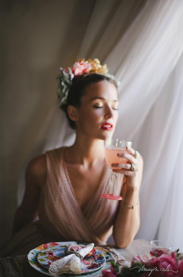 La verdad es que nunca he sido una persona mitómana, ni siquiera de pequeña o de adolescente. Cuando mis amigas suspiraban por los actores o cantantes de moda y empapelaban sus habitaciones con fotos o posters de ellos yo prefería colgar lo que yo consideraba mis ‘paneles de inspiración’ que no eran otra cosa que varios collage con miles de recortes, fotografías, notas, apuntes, entradas de teatro o de cine, portadas de libros o pinturas que por una u otra cosa llamaban mi atención y configuraban mi propio universo personal. Pero en ese universo alguna vez se colaba una figura que me deslumbraba y la que más recuerdo era la de Frida Kahlo. De ella me atraía prácticamente todo, su historia particular, sus vivencias, sus relaciones, su sufrimiento, su pintura autobiográfica y sobre todo la fuerza que respiraba y que la hacía sobreponerse a todas las dificultades que se le presentaban, que no eran pocas. Junto a Chavela Vargas creo que ambas compartían el ser de ese tipo de personas oníricas, seres especiales y mágicos que nos regala la vida para seguir aprendiendo. Su fuerza, su colorido, su estilismo llamativo y estridente y el ambiente mexicano que la rodeaba son los protagonistas del shooting de inspiración que hoy os traigo. Buceando por la red he podido encontrar varios bajo la misma temática pero ha sido este el que me ha resultado más inspirador. No os perdáis ninguna fotografía porque todo está cuidado y pensado al detalle, empezando por la impresionante corona de flores que tan de moda se ha puesto últimamente y que fue precisamente Frida el icono que la convirtió en tendencia. La decoración, con cubos rebosantes de grandes flores de distintos colores o la vajilla esmaltada, tiene reminiscencias mexicanas como no podía ser de otra manera. Lo mismo sucede con la invitación, una maravilla de diseño creativo y original, confeccionada en acuarela con relieve de papel de seda y con un trozo de volante de un vestido de ganchillo típico mexicano decorando el sobre. Sin olvidarnos del estilismo de la novia, en el que destaca el escote de su espalda y los labios en rojo pasión que recuerdan la Frida más sensual y femenina. Un placer para los sentidos que espero que disfrutéis.