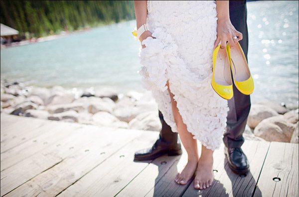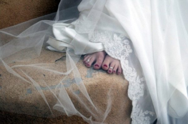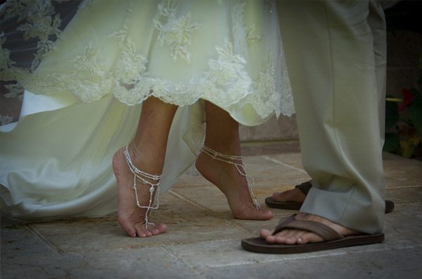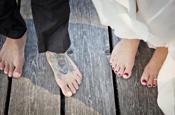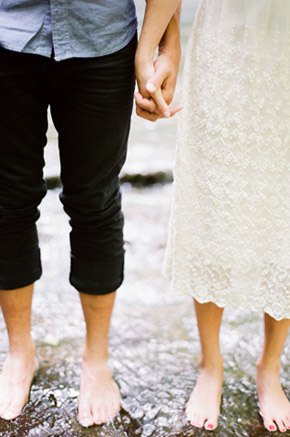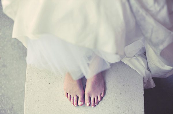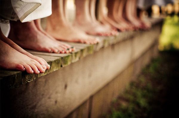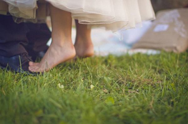 En el post de hoy no hablo de ideas, se trata únicamente de imágenes. Me gusta mucho cuando los novios o el propio fotógrafo buscan planos diferentes, encuadres imposibles o imágenes a las que a simple vista no damos importancia pero que cuando luego las vemos plasmadas en las fotografías nos acaban gustando muchísimo por lo que tienen de diferentes y originales. No hace mucho, en otro post, os hablaba de las fotos de las alianzas de boda y del juego que pueden dar según dónde las coloques o el enfoque que les des. Otra de las instantáneas que me encantan son las que salen retratados los pies de la pareja, como decía mi padre ‘a la persona se la conoce por los zapatos que usa’ y es cierto. A mí me gusta jugar a imaginar cómo será la pareja de novios cuando únicamente veo la fotografía de sus zapatos, si él ha preferido lucir unas zapatillas deportivas en lugar de unos zapatos relucientes con cordones o si ella se ha decantado por las espardeñas antes que por unos peep toes de tacón alto. Las imágenes de hoy no hablan de zapatos pero sí de lo que estos ocultan, ya que muestran los pies desnudos de la novia, del novio y en alguna ocasión incluso de todo el grupo de amigos y testigos. Es otra visión de la boda, otro punto de vista, una estética de imagen diferente, desde abajo, que puede transmitir mensajes de diversión, complicidad, romanticismo, protección… ¡No sabéis la de cosas que pueden contar los pies!