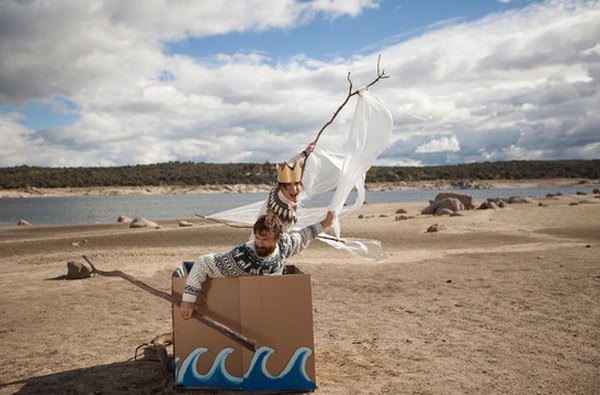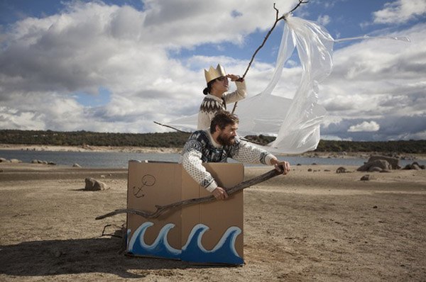 Hay parejas que a pesar de la edad y de los años siguen soñando como adolescentes, jugando como niños e imaginando historias fantásticas en mundos irreales. Son esas parejas que yo considero ‘especiales’ porque han logrado conservar a lo largo del tiempo ese brillo en los ojos, esa inocencia de la infancia, esa tremenda ilusión por vivir, jugar, reír, crear y sentir. Mar y Jens son una de esas parejas. Decidieron hacer su reportaje pre-boda en otoño porque buscaban algo diferente, un paraje singular bañado por esa luz tan característica en esa época del año. El motivo no fue otro que recrear los paisajes donde se inició su historia de amor. Se conocieron en Madrid pero cuando apenas llevaban unas semanas juntos, Mar se fue de vacaciones durante todo un mes a Islandia. Jens la echaba muchísimo de menos…, ese fue el primer verano de su amor. Al año siguiente ambos fueron de vacaciones a Suecia, la tierra de Jens, por lo que un año más, sus fotos de verano estaban inundadas de jerseys de lana nórdicos y paisajes helados junto a ríos y lagos de aguas cristalinas. Con estos antecedentes no fue difícil definir un estilismo para la sesión. Cuando Mar se reunió con Paula, la fotógrafa de Granvar encargada del diseño creativo del reportaje y esta le enseñó distintas referencias y estilos de iluminación, a Mar enseguida le vinieron a la mente todos los recuerdos de sus viajes a Suecia, Islandia, los jerseys, el amor y la amistad e inmediatamente el título de una película: ‘Where the wild things are’ (‘Donde viven los monstruos’), la adaptación cinematográfica del famoso cuento de Maurice Sendak, cuya historia gira en torno a un chico desobediente y rebelde con una imaginación desbordante, capaz de crear su propio mundo, habitado por unos monstruos gigantescos que le consideran su rey. Ese fue el leit motiv de la pre-boda de Mar y Jens, la recreación de un mundo imaginario y común, donde los personajes, ellos mismos, muestran escenas de su día a día. La pareja vive en un bosque encantado y cada mañana se despierta en una cama en medio de la naturaleza. Tras levantarse acuden a su árbol-aseo y se preparan para empezar un nuevo día cargado de aventuras. Se montan en su barca de cartón con la intención de buscar un lugar donde poder pescar para alimentarse, cuando lo encuentran sacan sus cañas y compiten para ver cuál de los dos se llevará la pieza más grande. Al final de la jornada llega la recompensa, el momento más esperado de su mundo imaginario, la hora del juego y de la diversión donde ambos disfrutan como enanos hasta la puesta de sol.