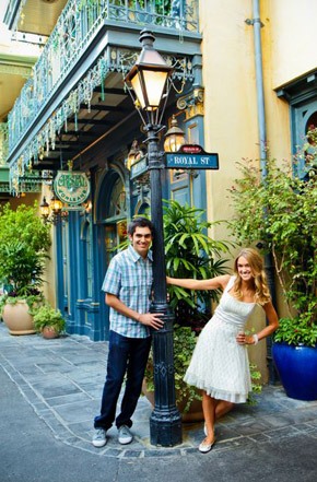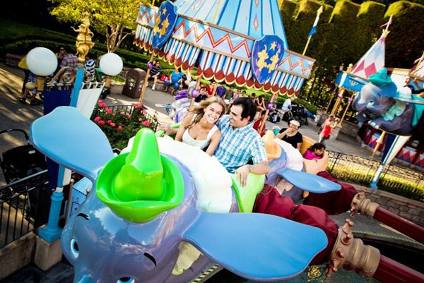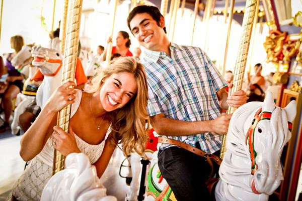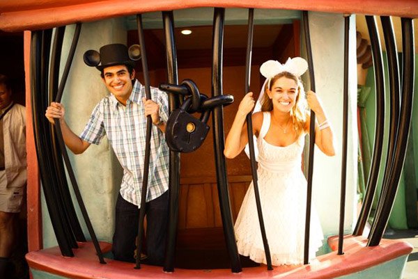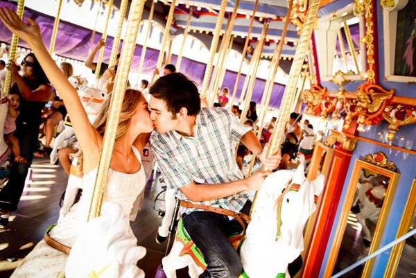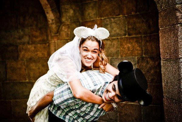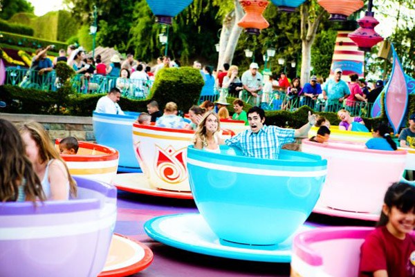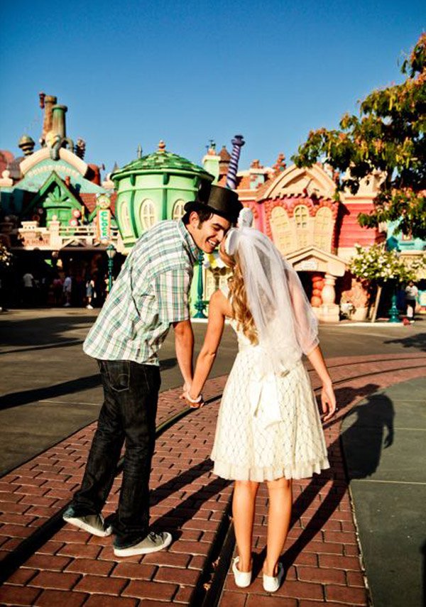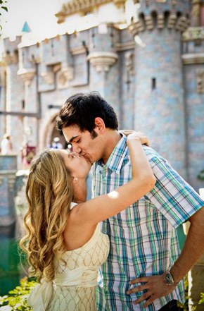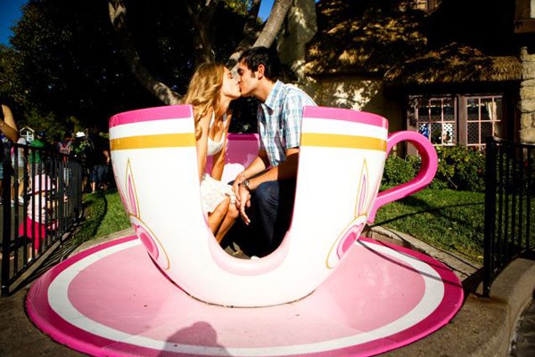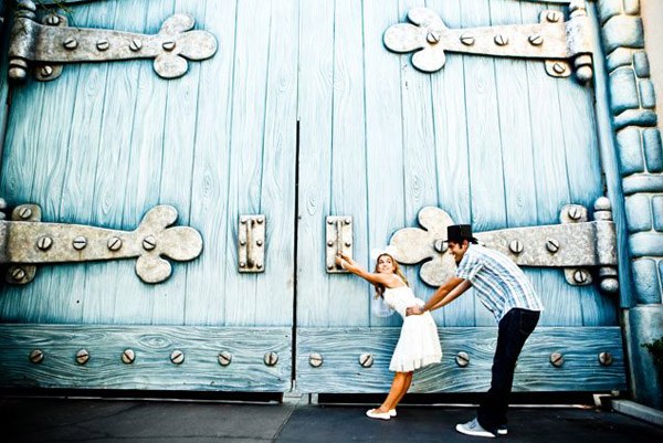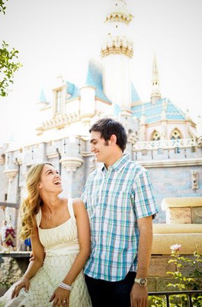 El primer beso de Megan y Jason como pareja fue en la Mansión Embrujada de un conocido parque temático americano, cuando el viaje ‘misteriosamente’ se interrumpió durante cinco minutos debido a una avería. Esa avería fue decisiva en sus vidas, por eso quisieron revivir ese momento en su sesión de fotos de compromiso. Me gustan las parejas que no pierden la ilusión a pesar de cumplir años, las que se emocionan todavía cuando van al circo o suben en el tio-vivo de una feria, las que se ponen pringosas cuando comen nubes de algodón o manzanas de caramelo y se agarran bien fuerte cerrando los ojos en el Tren de la Bruja. Megan y Jason disfrutaron como niños durante el reportaje ya que fue la excusa perfecta para no perderse ni una sola de las atracciones, pasaron de los caballos del carrusel a los lomos de Dumbo, después a las tazas de té que giraban sin parar, más tarde visitaron la casa del árbol de Tarzán y, por supuesto, la casita de Minnie. Se las arreglaron como pudieron para esquivar a la multitud de turistas que había en el parque con la excusa de que estaban haciendo un reportaje de compromiso de boda y consiguieron una foto privada frente al Castillo de las princesas sin turistas alrededor, algo realmente imposible en Disneyland. Durante toda la sesión se comportaron como auténticos personajes de dibujos animados, divertidos, traviesos, bromistas, alegres, osados y tiernos. Para ellos fue mucho más que una sesión de fotos, fue la culminación de una historia de amor real en un entorno de cuento.