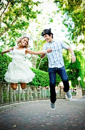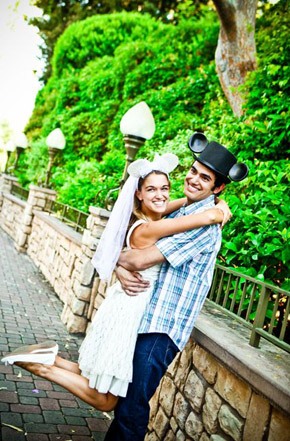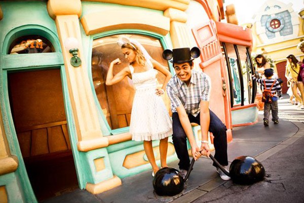 El primer beso de Megan y Jason como pareja fue en la Mansión Embrujada de un conocido parque temático americano, cuando el viaje ‘misteriosamente’ se interrumpió durante cinco minutos debido a una avería. Esa avería fue decisiva en sus vidas, por eso quisieron revivir ese momento en su sesión de fotos de compromiso. Me gustan las parejas que no pierden la ilusión a pesar de cumplir años, las que se emocionan todavía cuando van al circo o suben en el tio-vivo de una feria, las que se ponen pringosas cuando comen nubes de algodón o manzanas de caramelo y se agarran bien fuerte cerrando los ojos en el Tren de la Bruja. Megan y Jason disfrutaron como niños durante el reportaje ya que fue la excusa perfecta para no perderse ni una sola de las atracciones, pasaron de los caballos del carrusel a los lomos de Dumbo, después a las tazas de té que giraban sin parar, más tarde visitaron la casa del árbol de Tarzán y, por supuesto, la casita de Minnie. Se las arreglaron como pudieron para esquivar a la multitud de turistas que había en el parque con la excusa de que estaban haciendo un reportaje de compromiso de boda y consiguieron una foto privada frente al Castillo de las princesas sin turistas alrededor, algo realmente imposible en Disneyland. Durante toda la sesión se comportaron como auténticos personajes de dibujos animados, divertidos, traviesos, bromistas, alegres, osados y tiernos. Para ellos fue mucho más que una sesión de fotos, fue la culminación de una historia de amor real en un entorno de cuento.