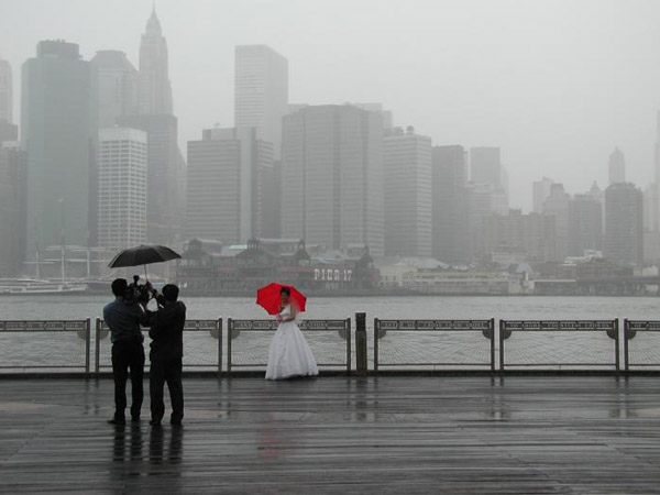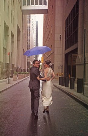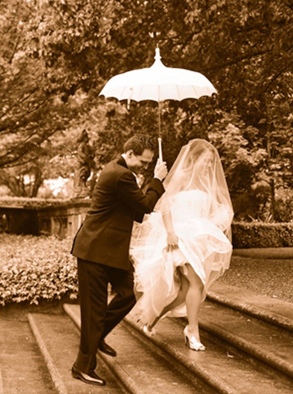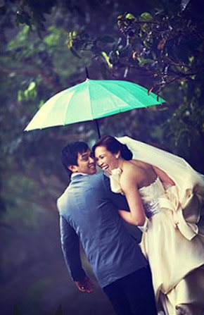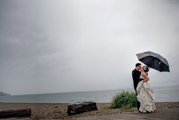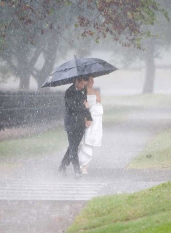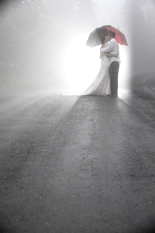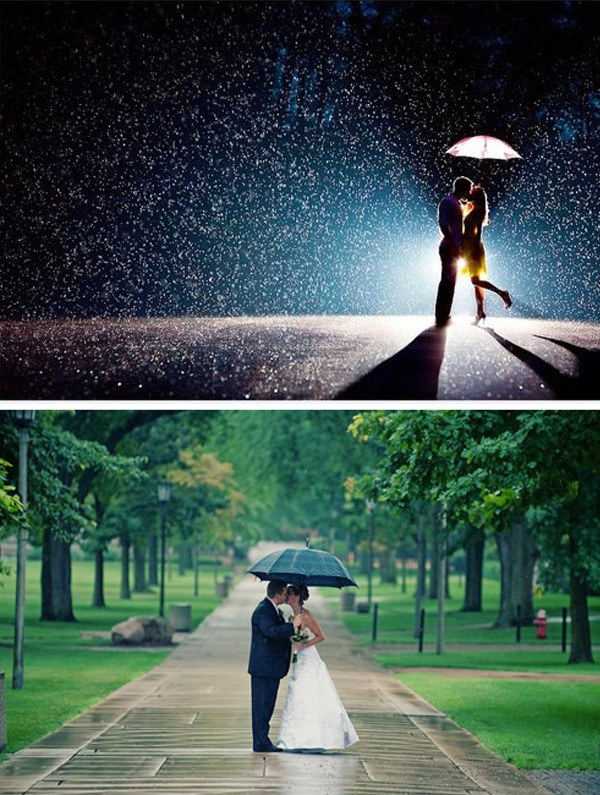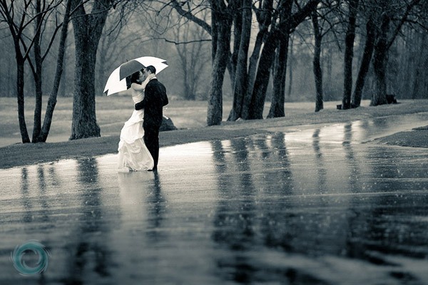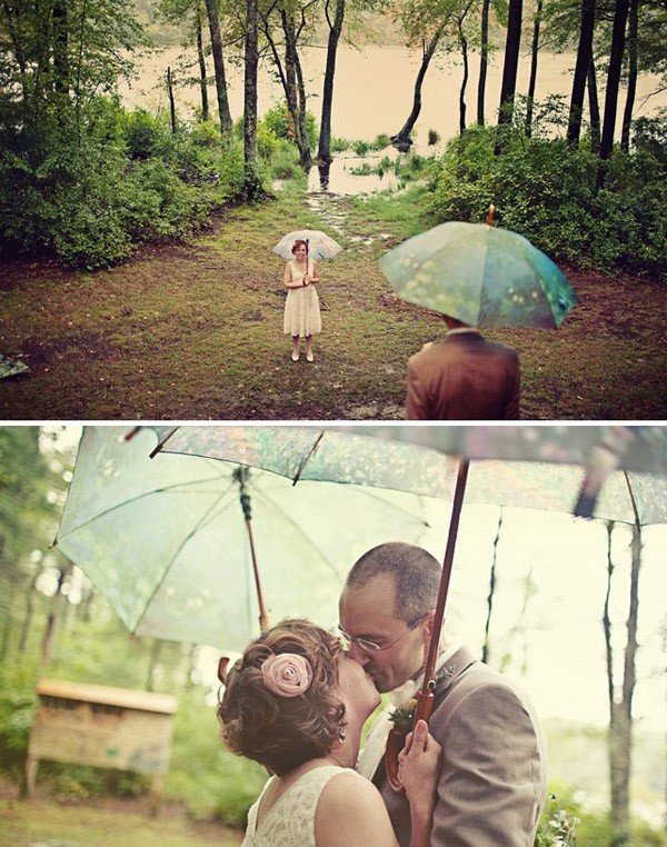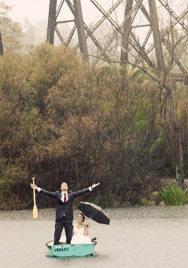 ¿Qué tendrán las bodas de otoño que me producen siempre una sensación de nostalgia? Dicen los entendidos que los cambios de temperatura provocan en nosotros cambios internos emocionales y en mi caso doy de fe de que es así. No puedo evitarlo, soy espíritu de verano así que cuando llega el otoño me viene esa especie de ‘morriña’ de la que tanto saben nuestras seguidoras gallegas. Ya os he comentado muchas veces que cada vez me gustan más las bodas en invierno, es cierto que tienen factores en contra y que normalmente el factor más importante suele estar relacionado con las bajas temperaturas pero yo soy de las que opina que todo tiene su parte buena así que si habéis decidido casaros en invierno, ¿por qué no disfrutar al cien por cien de todo lo que ello implica? Y cuando digo todo, me refiero también al tiempo. Si es cierto el dicho que dice que ‘boda lluviosa, boda dichosa’, ¿por qué entristecernos si llueve el día de nuestra boda? Hay que darle la vuelta, coger un paraguas o, todavía mejor, no cogerlo y salir a la calle rumbo a la iglesia o al lugar de la ceremonia con la mejor de nuestras sonrisas y dejando que la lluvia lo inunde todo. No importa que nos mojemos, al contrario, ¿no habéis probado nunca dejar que la lluvia os empape hasta calaros? Si no lo habéis hecho os lo recomiendo, es una sensación única, de libertad, de dejarse llevar, de sentir la naturaleza golpeando en forma de gotas sobre nuestro rostro y si lo hacéis acompañados de vuestra pareja la sensación todavía es mejor, se multiplica por diez. Cogeos de la mano y empezad a saltar charcos, os sentiréis como niños, nada importará alrededor, solo vosotros, la lluvia y vuestro amor. Os dejo con unas fotografías que seguro que os inspirarán a calzaros las botas de agua y salir corriendo.