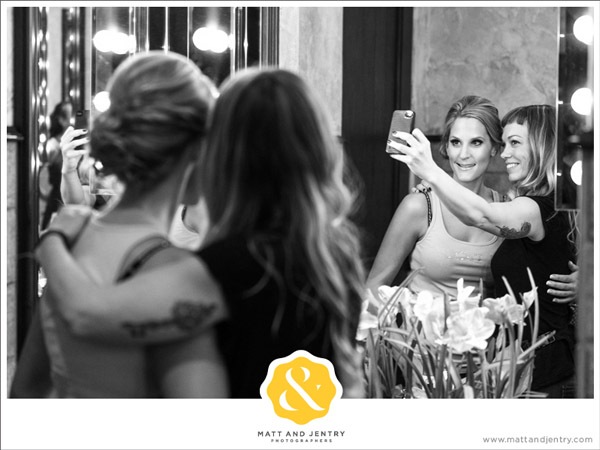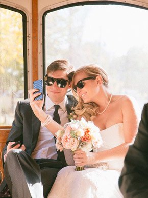 Existe alguien que todavía no sepa lo que es un selfie? Pues por si acaso os lo explico, no sea que haya algún despistadillo por aquí, en una palabra un selfie vendría a ser lo que se conoce como un Autorretrato. Es un término que se utiliza en internet para referirnos a una fotografía que se hace uno mismo y se publica on-line. Las redes sociales los han puesto de moda, hay selfies por todas partes, no hay blogger que se preste que no tenga varios selfies con distintas expresiones o looks colgados en su Instagram. El más común suele ser una persona sosteniendo la cámara o el móvil a o largo de todo su brazo con el objetivo apuntando a sí mismo, otra modalidad es apuntar la cámara a un espejo y luego está el conocido como selfie de grupo, en el que sale más de una persona. Y como todas las modas, tarde o temprano acaban llegando también al mundo de las bodas, así que no os extrañéis si este año vais a una boda y en el momento de salir los novios estos están más pendientes de hacerse un selfie que del confetti. Claro que también pueden participar los invitados y aprovechar la foto de familia para hacer un gran selfie de grupo. En el post de hoy he recopilado varios momentos, individuales y en grupo, en los que los novios o los invitados de la boda hacen sus propios selfies. Hay imágenes de todo tipo, divertidas, románticas, tiernas, sensuales o atrevidas pero la verdad es que es una instantánea original para inmortalizar en el álbum de vuestros recuerdos de boda on-line, no os parece?