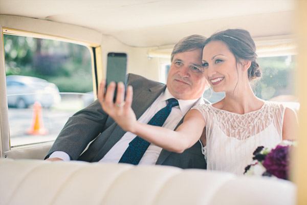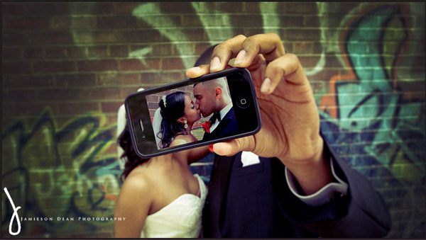 Existe alguien que todavía no sepa lo que es un selfie? Pues por si acaso os lo explico, no sea que haya algún despistadillo por aquí, en una palabra un selfie vendría a ser lo que se conoce como un Autorretrato. Es un término que se utiliza en internet para referirnos a una fotografía que se hace uno mismo y se publica on-line. Las redes sociales los han puesto de moda, hay selfies por todas partes, no hay blogger que se preste que no tenga varios selfies con distintas expresiones o looks colgados en su Instagram. El más común suele ser una persona sosteniendo la cámara o el móvil a o largo de todo su brazo con el objetivo apuntando a sí mismo, otra modalidad es apuntar la cámara a un espejo y luego está el conocido como selfie de grupo, en el que sale más de una persona. Y como todas las modas, tarde o temprano acaban llegando también al mundo de las bodas, así que no os extrañéis si este año vais a una boda y en el momento de salir los novios estos están más pendientes de hacerse un selfie que del confetti. Claro que también pueden participar los invitados y aprovechar la foto de familia para hacer un gran selfie de grupo. En el post de hoy he recopilado varios momentos, individuales y en grupo, en los que los novios o los invitados de la boda hacen sus propios selfies. Hay imágenes de todo tipo, divertidas, románticas, tiernas, sensuales o atrevidas pero la verdad es que es una instantánea original para inmortalizar en el álbum de vuestros recuerdos de boda on-line, no os parece?