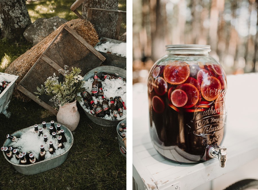 Todos coincidieron en afirmar que la boda era un fiel reflejo de la personalidad de los novios, sencilla y tremendamente espontánea. Natalia lució dos vestidos para su gran día, durante la ceremonia lució un romántico diseño de Ramón Herrerías con bordados sobre tul de plumeti y un gran lazo de terciopelo verde hierba que cerraba la cintura enmarcando una sensual espalda y para el momento de la fiesta se decantó por un modelo de Womance con flecos y de estética más festiva que le permitió abrir el baile a ritmo de tango junto a David. Aunque toda la boda fue organizada por ellos, de la decoración y detalles se encargó la propia finca, siguiendo en todo momento las pautas de los novios. Todo el banquete tuvo lugar al aire libre bajo la sombra de un gran tipi, con una cuidada puesta en escena de estética rústica donde las flores y la madera jugaron un papel destacado. Los novios querían que los invitados pudieran tomar bebidas desde el momento de la ceremonia, así que dispusieron en esa zona de una Vermutería con sangría y limonada fresca, una gran idea para aliviarse de las altas temperaturas de ese día y durante el cóctel, servido por Quilicuá, se decantaron por una gastronomía con pinceladas exóticas. Un bufet mejicano, otro asiático y una barra de cervezas del mundo, junto a otra de Pisco Sour y un carrito de helados artesanos, hicieron las delicias de los invitados. Y, como no podía ser de otra manera, disfrutaron de la música en directo de La Niña Vintage, esa música que les había llevado hasta allí haciéndoles vivir, casi sin imaginarlo, uno de los mejores días de su vida. ¡Toda la felicidad del mundo para ellos!