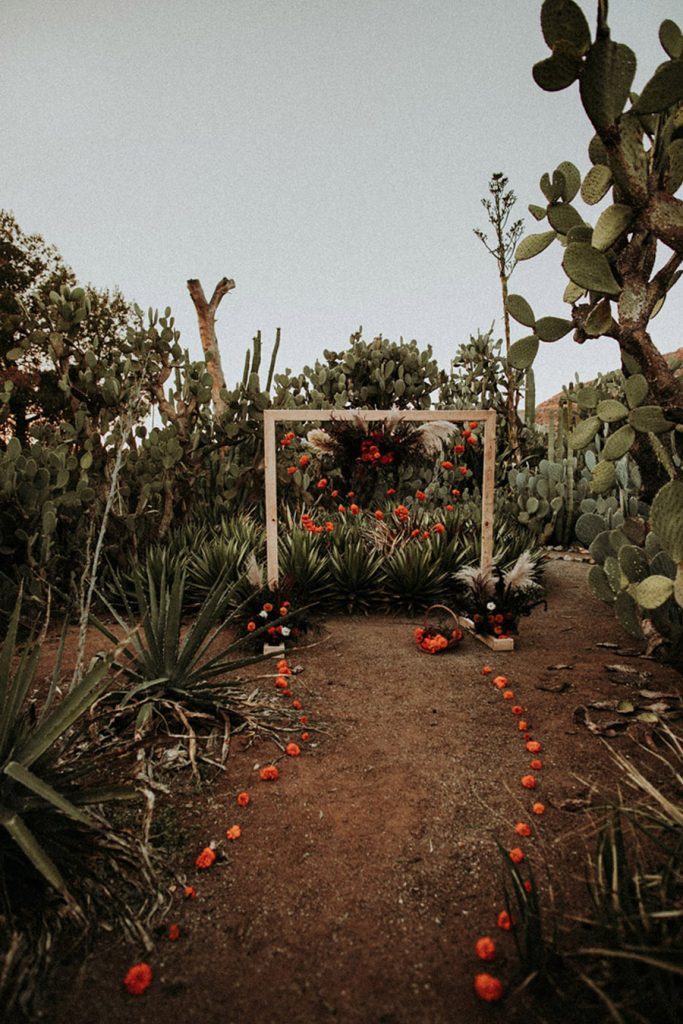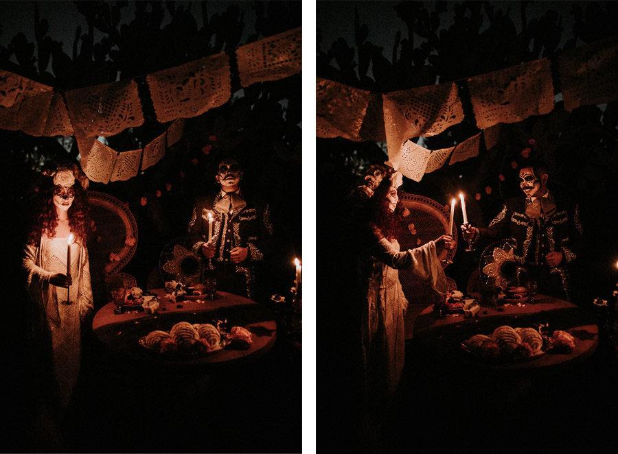 A falta de un par de días para Halloween ya han empezado a asomar las primeras calabazas, arañas y calaveras en los escaparates, restaurantes, colegios y cualquier otro sitio que se preste a la celebración de esta tradición que nos acompaña desde niños. A mí, que me gusta celebrarlo todo, no me preguntéis si soy más de Halloween o de Castañada porque os diré que me gusta tanto una como otra, así que por qué quedarse con una de ellas si de las dos podemos sacar lo mejor. En esta línea de celebración y ya que los viernes los solemos dedicar a las bodas, he querido compartir con vosotros una boda real celebrada el Día de Difuntos. Me ha gustado especialmente toda la estética que gira en torno a la tradición mexicana de ese día, en la que los protagonistas son las personas que ya no están junto a nosotros en cuerpo pero que estoy segura siguen presentes acompañándonos con su alma. Se trata de una boda real, la de Tirza y Chris, celebrada en el Valle de Jurupa, en California. Una boda que inicialmente iba a ser muy diferente pero a medida que los novios se acercaban al día señalado, decidieron cambiar sus planes por completo y celebrar una boda íntima que rindiera homenaje a sus seres queridos basándose en la tradición mexicana del Día de Muertos. Por desgracia, la mayoría de su familia falleció y al ser ambos de origen mexicano, encontraron en este día el momento perfecto para recordarles y honrar su memoria. Toda la decoración combina tonos negros, dorados y naranjas y gira en torno a un ‘altar’ a modo de mesa, decorado con distintas fotografías enmarcadas de los familiares fallecidos de los novios, acompañadas de una ofrenda de dulces tradicionales y un pastel de bodas otoñal. Los novios están caracterizados con un maquillaje de calavera y la novia viste un diseño de inspiración boho con una corona de flores al más puro estilo Catrina, símbolo de la muerte e icono del Día de Muertos en México. El novio toca en una banda de mariachis con alguno de sus familiares y amigos más cercanos, por lo que para la boda lució el traje tradicional de mariachi. Tras la ceremonia, Tirza y Chris celebraron un banquete en la intimidad siguiendo la misma pauta decorativa y en el que no faltó la típica cerveza mexicana, con la que brindaron por su felicidad y el bienestar de los suyos.