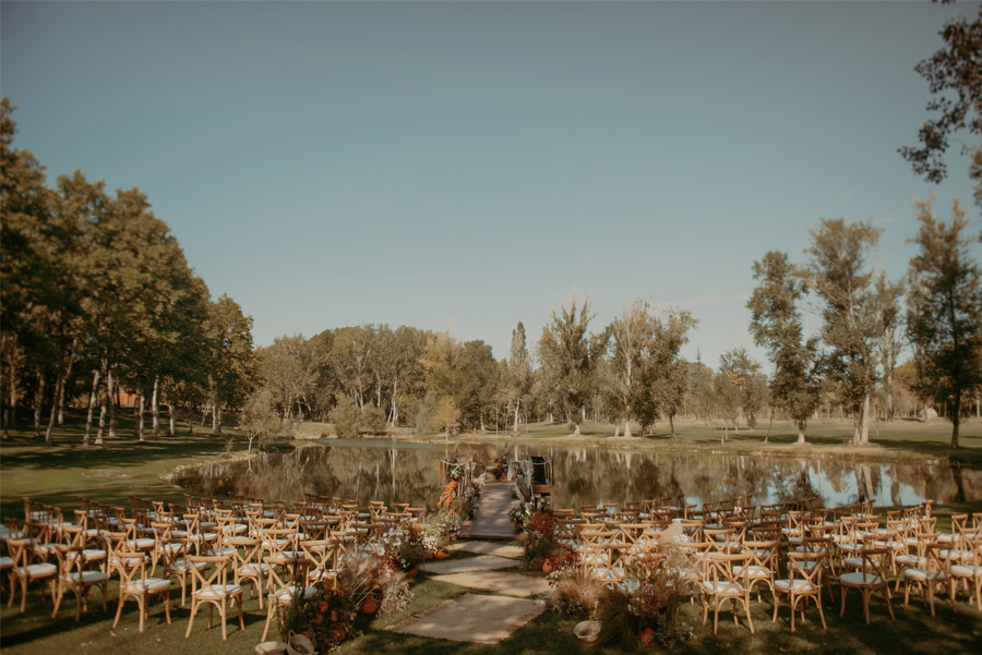 La ceremonia fue religiosa y tuvo lugar en el embarcadero. Todos los invitados se dispusieron frente al lago en sillas de madera creando un espacio en total armonía con el entorno, exquisitamente decorado por el equipo de Go Floral. Mireia lució un romántico y sencillo diseño con mangas abullonadas de YolanCris, velo largo y un recogido desenfadado que le daba un aire fresco y natural a su look.