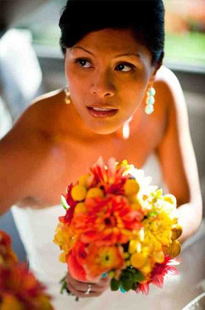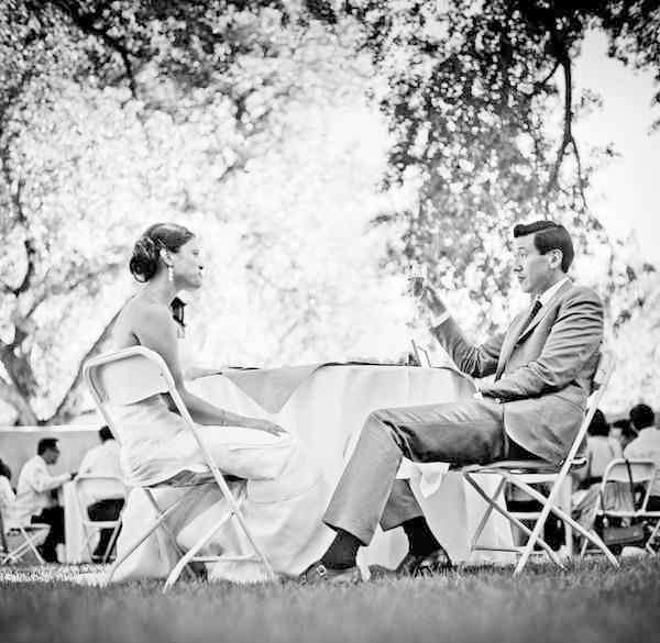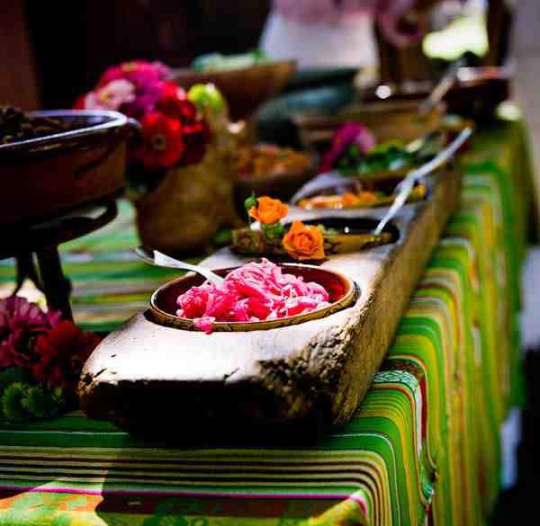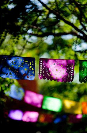 Adrianne y Stephen tenían claro que querían celebrar su boda en Nuevo Mexico, la ciudad donde nacieron, a pesar de que ambos han vivido la mayor parte de su vida en California. También tenían claro que querían agasajar a sus invitados con la típica comida mexicana, ya que las comidas y reuniones con familiares y amigos habían sido muy importantes en su relación de pareja. Buscaban una boda divertida, sencilla, rústica y muy natural y lo consiguieron. Se casaron en una iglesia católica de estilo art-decó al norte de Albuquerque y luego se trasladaron a la Hacienda Vargas, donde les esperaba un exquisito almuerzo al aire libre, seguido de una gran fiesta al atardecer. La Hacienda Vargas fue todo un descubrimiento para ellos, ya que buscaban un lugar que reflejase la belleza natural de Nuevo Mexico y la Hacienda tiene un hermoso patio al aire libre con grandes árboles que en verano dan una sombra fresca y agradable. Durante el almuerzo se sirvieron todo tipo de variedades mexicanas: carnitas, frijoles, tortillas, salsas frescas, pimientos asados… y en lugar de pastel optaron por servir helados, una opción mucho más refrescante para el día tan caluroso que salió. Me ha gustado mucho la idea que tuvieron los novios para el almuerzo, ya que quisieron recrear la idea de un restaurante rústico al aire libre, por lo que los cubiertos eran de madera y las sillas de metal. Para la mantelería usaron papel de carnicero y en cada mesa colocaron varios lápices de colores para que los invitados pudieran crear sus propias obras de arte mientras comían, algunos incluso se atrevieron a escribir un poema. La nota de color la puso el centro de mesa, confeccionado con pequeñas latas plateadas llenas de mandarinas. La verdad es que adoro el colorido que respiran las bodas mexicanas y la alegría que transmiten todas las imágenes, muchos de nuestro seguidores lo saben porque nos siguen desde el otro lado del océano… a todos ellos va dedicado este post.
