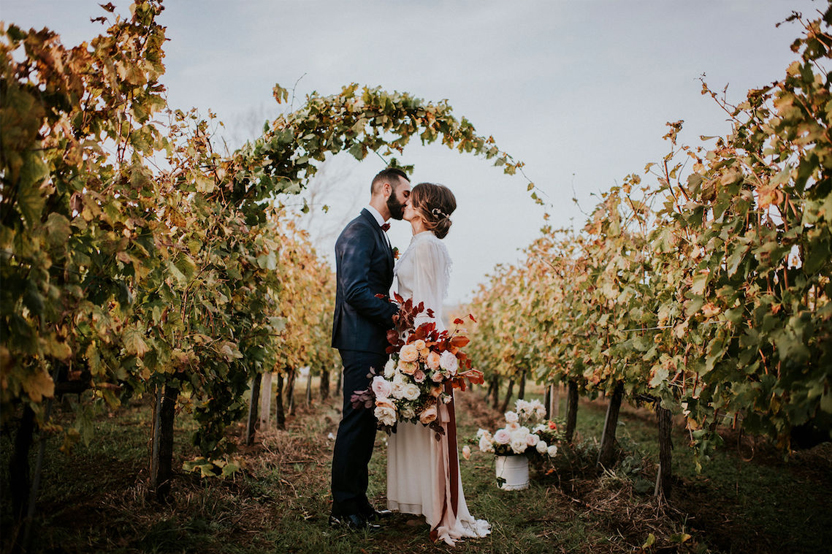 ¿Puede haber algo más romántico que casarse en un viñedo? Pues seguro que sí, pero no me digáis que no es una opción ideal para celebrar una boda en otoño. A mí me encanta el campo en esta época del año, sus formas, sus colores, poder respirar aire fresco por las mañanas o sentir el suave calor del sol a media tarde. Casarse en otoño, al aire libre y en plena naturaleza, hace que no exista mejor decoración para una boda. Todo es tremendamente romántico en esta sesión de inspiración, celebrada en la campiña italiana, que hoy os comparto. Los novios avanzan entre viñedos, cogidos de la mano, rodeados de un ambiente íntimo y relajado, caminando hacia un altar natural creado por un arco retorcido de vides, como si estuvieran destinadas a crecer de esa manera, con cálidas hojas de parra en tonalidades otoñales que brindan un color y una textura especial a la ceremonia. La novia luce un vestido de aire vintage y un moño bajo sujeto por un fino y discreto tocado con forma de rama, junto a un ramo de otoño lleno de rubor, rosas blancas y hojas rojas, que dan el toque de color a su estilismo. Tras la ceremonia se dirigen a la zona de banquete, donde les espera una romántica mesa de madera antigua con un centro floral central en los mismos tonos y composición que el ramo de la novia, en el que predominan los rosas, blancos, burdeos y verdes, junto a varios candelabros de cobre y un sittting caligrafiado siguiendo la misma línea gráfica y tonalidad de la papelería. Toda la decoración respeta los movimientos naturales de la naturaleza, su ritmo y su belleza, integrándose por completo en el entorno. La velada finaliza al atardecer, cuando la luna hace su tímida aparición y cientos de luces iluminan el baile de los novios frente a las viñas. ¿Quién más sueña con una boda de otoño en la campiña italiana?