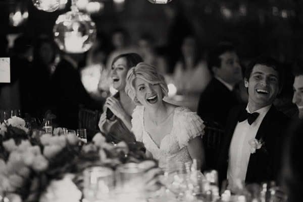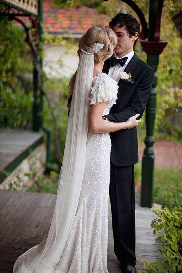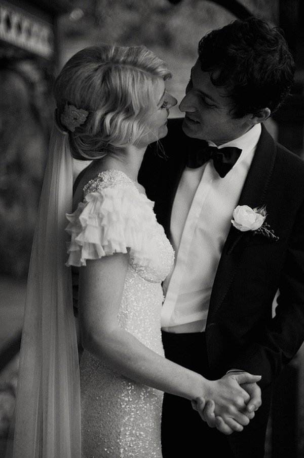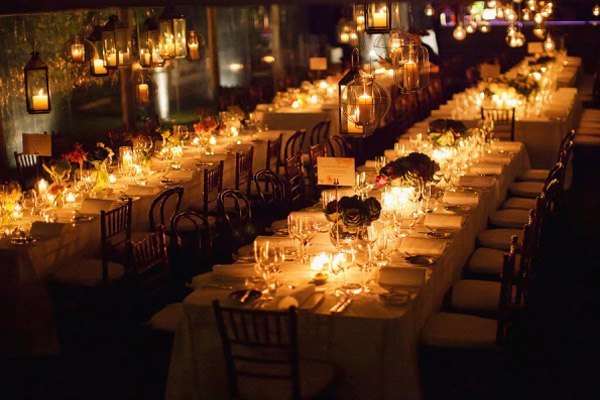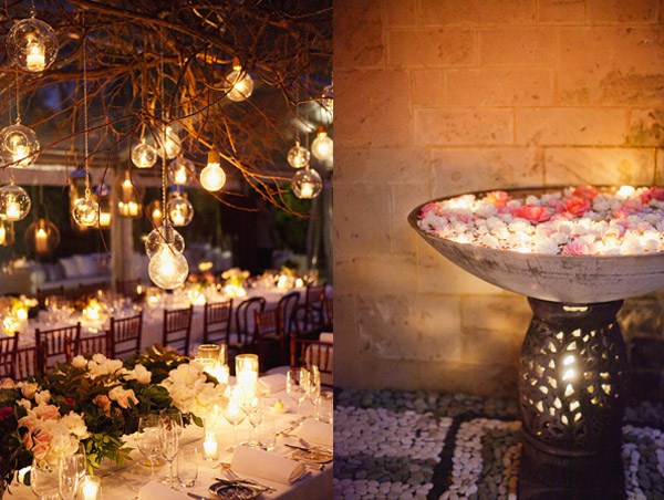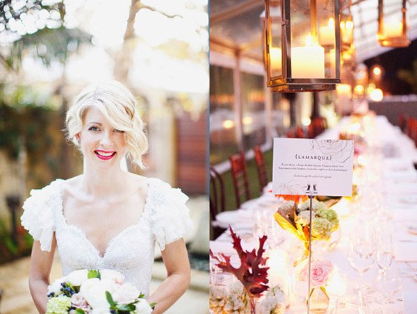 Hoy he querido recuperar una boda que en su día me gustó mucho por dos motivos, el vestido de la novia y la decoración. Empezaré por el primero, un vestido de inspiración años 50 con lentejuelas blancas y pequeños volantes en las mangas, un detalle precioso que le da un aire todavía más chic a la novia. El peinado me ha parecido perfecto y muy acertado con el estilo del vestido, un semi-recogido con ondas al agua sujeto por un broche antiguo del que sale un velo de tul. Este tipo de peinados es muy cómodo si lo que queréis es cambiar de look de forma rápida y fácil a la hora de la fiesta, ya que permite soltarse la melena prácticamente sin despeinarse. Por otro lado, los labios rojos rompen un poco con la inocencia en la estética de la novia (tez blanca, cabello rubio y ojos azules), haciendo un guiño a la sensualidad de su lado más sexy, no creéis? El otro punto que llamó mi atención, como os comentaba, es la decoración. Ese juego de luces que dan las bombillas colgadas a diferentes alturas desde unas ramas de árbol. Vistas desde el interior dan un ambiente cálido y acogedor, pese a celebrarse el enlace en el interior de una carpa y eso lo favorece el hecho de que la carpa sea totalmente transparente, por lo que da la sensación de estar realmente en medio de un jardín. Además de las bombillas, que le dan un aire más industrial, estas se han combinado con diferentes farolas de distintos materiales en cuyo interior hay velas encendidas, igual que en los centros de mesa que combinan flores con velas. Las farolas también cuelgan de las ramas de árbol, por lo que la mezcla de luz eléctrica y luz natural acentúa todavía más el mágico ambiente que se respira. Es curioso comprobar que después de haber transcurrido ya varios años desde que publiqué esta boda, todavía siga siendo tendencia tanto en la decoración como en el estilismo nupcial, lo que corrobora mi teoría de que cuando algo es realmente bonito lo será también a través del tiempo. Que disfrutéis de la boda!