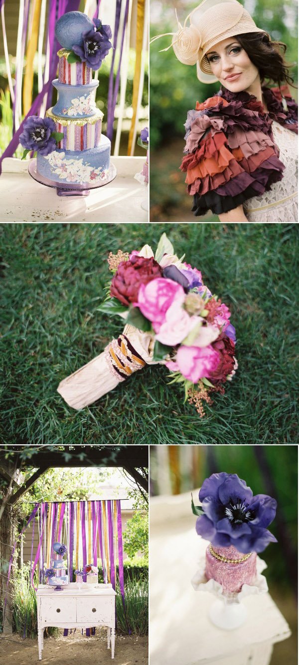 Quedan pocos días para que se celebre uno de los acontecimientos más esperados en el mundo las bodas, el enlace del Príncipe Guillermo de Inglaterra con Kate Middleton y este hecho precisamente ha sido la inspiración para el reportaje de boda que hoy os traigo. Se ha querido recrear  un ambiente británico que, como podéis ver,  está presente en todos los detalles: grandes sombreros, bolsas de té, colores vivos y  una decoración de época de estilo inglés con un toque refinado y ligeramente moderno. Los encargados de realizar el reportaje crearon elementos personalizados para la sesión de fotos, como la original lámpara de techo tipo araña situada sobre la mesa principal y confeccionada con 700 bolsitas de té, algo muy típico en la sociedad inglesa. También se confeccionó con ayuda del mismo material el sitting de mesas, en este caso en cada bolsita de té estaban escritos los nombres de los invitados, así como la pared de tela que hace las veces de fondo decorativo de la ceremonia, confeccionada con tela texturada y 26 platos de loza  antigua diferentes. Mención aparte merecen los arreglos florales y la repostería, creados con un mimo especial. Aunque a mí particularmente donde se me han ido los ojos desde el principio es en el vestido y los complementos de la novia. Está ideal con ese espectacular sombrero y la combinación de los dos tocados, uno tipo birdcage y el otro a modo de diadema. ¿Y qué me decís del bolero en tonos malvas? Junto al bouquet floral le da el toque de color perfecto.