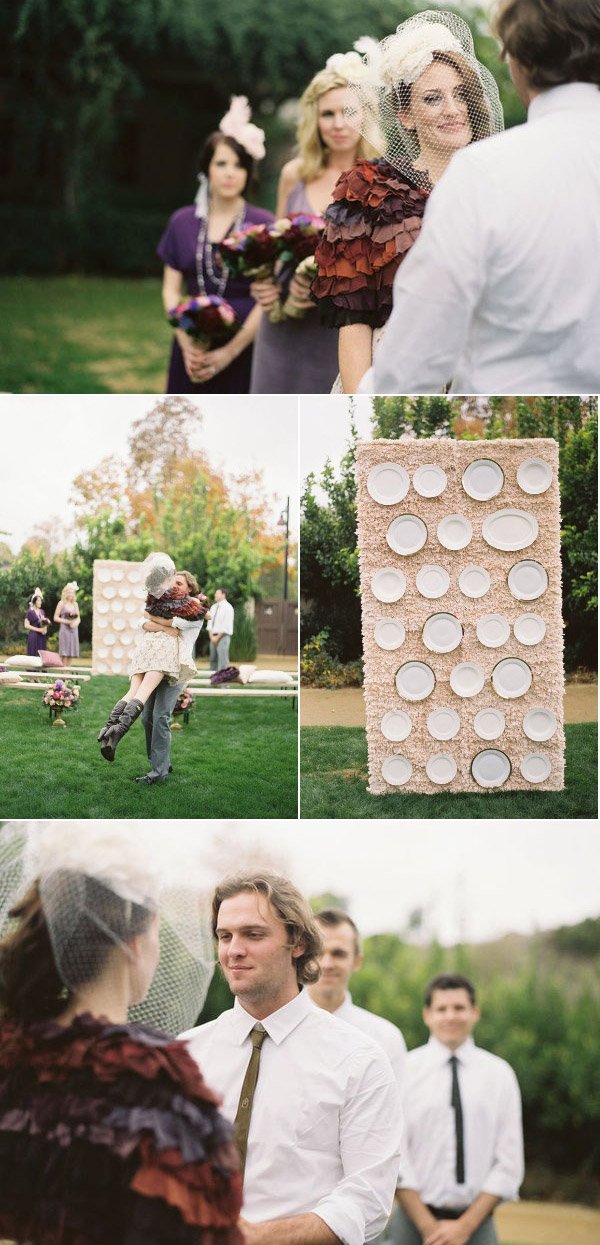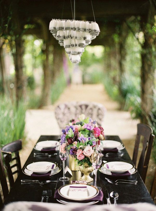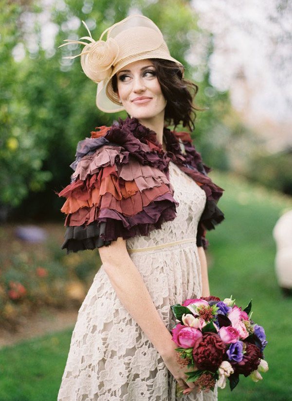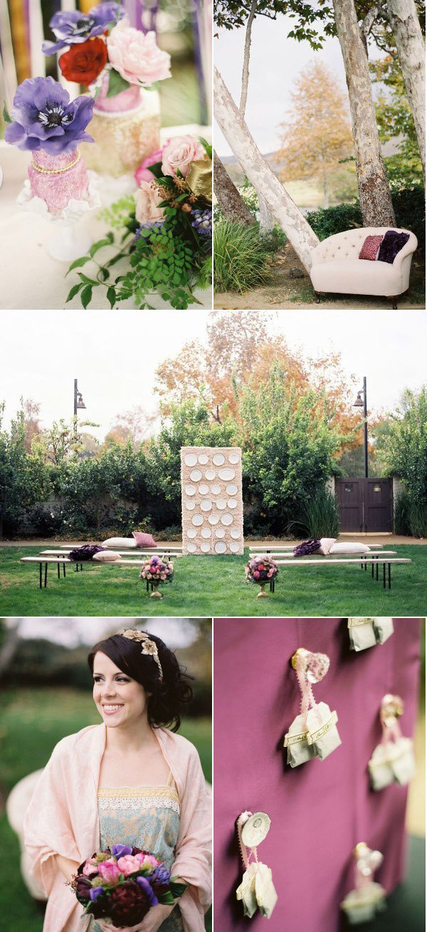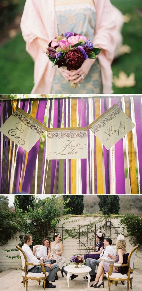 Quedan pocos días para que se celebre uno de los acontecimientos más esperados en el mundo las bodas, el enlace del Príncipe Guillermo de Inglaterra con Kate Middleton y este hecho precisamente ha sido la inspiración para el reportaje de boda que hoy os traigo. Se ha querido recrear un ambiente británico que, como podéis ver, está presente en todos los detalles: grandes sombreros, bolsas de té, colores vivos y una decoración de época de estilo inglés con un toque refinado y ligeramente moderno. Los encargados de realizar el reportaje crearon elementos personalizados para la sesión de fotos, como la original lámpara de techo tipo araña situada sobre la mesa principal y confeccionada con 700 bolsitas de té, algo muy típico en la sociedad inglesa. También se confeccionó con ayuda del mismo material el sitting de mesas, en este caso en cada bolsita de té estaban escritos los nombres de los invitados, así como la pared de tela que hace las veces de fondo decorativo de la ceremonia, confeccionada con tela texturada y 26 platos de loza antigua diferentes. Mención aparte merecen los arreglos florales y la repostería, creados con un mimo especial. Aunque a mí particularmente donde se me han ido los ojos desde el principio es en el vestido y los complementos de la novia. Está ideal con ese espectacular sombrero y la combinación de los dos tocados, uno tipo birdcage y el otro a modo de diadema. ¿Y qué me decís del bolero en tonos malvas? Junto al bouquet floral le da el toque de color perfecto.