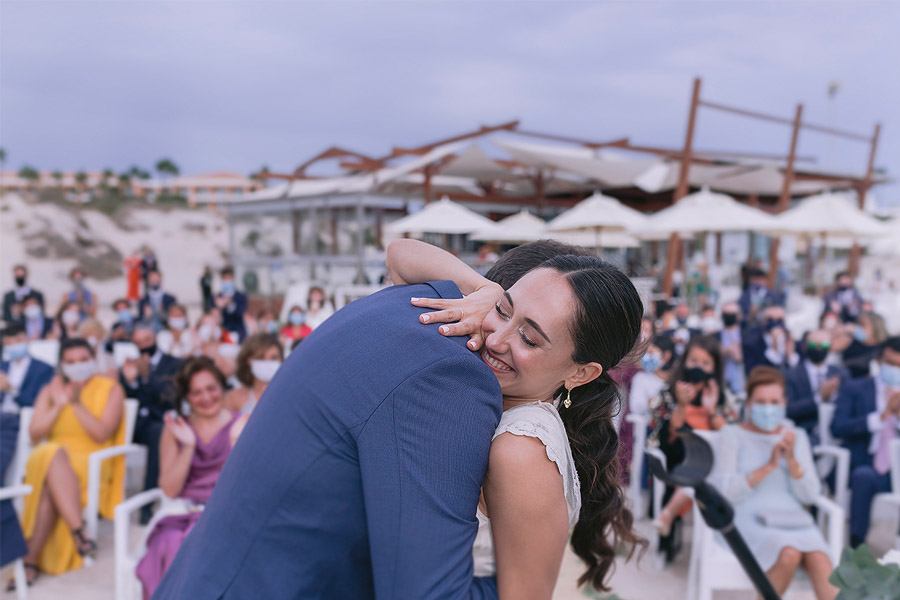 Hacía tiempo que quería agradecer de alguna forma toda la labor que los sanitarios de nuestro país han hecho, no sólo durante la pandemia, sino siempre porque toda su vida profesional es puro servicio hacia los demás. Pocos sectores son tan bondadosos y desinteresados como el de la salud, personas que ponen todo su esfuerzo, corazón, dedicación y conocimiento en manos de la ciencia con el objetivo principal de salvar vidas, nuestras vidas. Por eso, antes de acabar un año tan difícil como ha sido este 2020 para todos nosotros no podía dejar de publicar una boda llena de esperanza y de ilusión, la de dos médicos que decidieron casarse en plena pandemia luchando desde dentro y también desde fuera para conseguir su sueño. La historia comienza cuando un gaditano decide hacerse cirujano en Madrid y una joven madrileña decide hacer lo mismo unos años después. Así nos lo cuenta la propia novia, Maday: ‘Tras los 5 años de formación de Enrique en el Hospital Clínico se fue a trabajar a otros hospitales, momento en el que yo comencé mi formación en ese mismo hospital, así, sin cruzarnos, sin ninguno saber de la existencia del otro. Tres 3 años después él volvió y de repente por las mañanas, cuando estaba de guardia, me cruzaba con él, cirujano cardíaco, alto, con sus ojos azules, su paso desgarbado, su sonrisa y sus buenos días. Yo le apartaba la mirada de nervios y así poco a poco nos fuimos saludando y hablando una frase, dos… Hasta que me tocó pasar por sus quirófanos como parte de mi formación. En una cirugía trató de impresionarme poniéndose chulito. Menudo ‘fantasma’ pensé, pero poco a poco su gracia del sur y su mirada me fue conquistando y seguimos saludándonos por los pasillos durante meses. Así hasta una fiesta de navidad del hospital en la que pensando cada uno que el otro era inalcanzable Enrique se sinceró y yo le besé’. Unos meses después, Enrique y Maday se fueron a vivir juntos y así estuvieron hasta que Enrique decidió pedirle a Maday que se casara con él, hincando rodilla en su restaurante favorito. La respuesta de Maday fue un SÍ rotundo. Esas navidades fueron a Cádiz, la tierra natal de Enrique, y allí en un precioso atardecer en la playa de Sancti Petri decidieron que ese sería el lugar perfecto para casarse. ‘Elegimos el 20 de junio de 2020 a las 19.30h para compartir el atardecer más bonito del mundo junto con nuestros seres queridos. Habíamos repasado videos de la música, dado mil vueltas al menú, a los invitados, nos sabíamos todo de memoria… Pero el destino decidió que viniera una pandemia. En marzo de 2020 nadie, ni siquiera nosotros trabajando en hospitales de Madrid y viendo diariamente el horror que estaba ocurriendo, pensábamos que esto duraría tanto como para no poder hacer una boda normal en junio. Pero poco a poco todas las ilusiones se fueron desvaneciendo, hasta que en mayo y con todas las invitaciones sin entregar y en casa desde principios de marzo, decidimos aplazar la boda ante la imposibilidad siquiera de salir de Madrid por el confinamiento que ya se hacía insoportable’. Varias fechas rondaron por la mente de la pareja pero no querían aplazarla mucho, así que se decidieron por el mes de septiembre. Pero a finales de agosto otra vez las cosas volvieron a torcerse. ‘Pasamos miedo, mucho miedo e incertidumbre ante las noticias en prensa de un posible nuevo confinamiento y los cambios de normas diarios. Rondaba constantemente por nuestra mente la probable posibilidad de tener que volver a aplazar de nuevo la boda sin fecha futura. Pero teníamos mucha ilusión y seguimos adelante. A una semana tuvimos que cambiar el grupo de la ceremonia, la hora de la boda (ya no coincidiría con el atardecer) y mil cambios más, pero finalmente llegó el momento de recoger mi vestido, de coger el coche y plantarnos en Cádiz y ya nada podía parar nuestra alegría. Hubo cancelaciones de invitados, bastantes, pero al final quien quiso estaba y estaban los importantes’, cuenta Maday. Los que les acompañaron lo vivieron como unas mini-vacaciones, un respiro en medio de un año incierto. Hicieron una pre-boda preciosa, esta vez sí al atardecer, en el chiringuito de la playa del Hotel Barrosa Palace y una emotiva boda al día siguiente en la playa oficiada por un amigo y maestro de la pareja, el Doctor Rodrigo Rial, acompañados de comparsas que cantaron coplas del carnaval gaditano. El cóctel se celebró en la piscina, al aire libre, con música en directo y todas las medidas adaptadas por la pandemia y el banquete tuvo lugar en el salón de gala del hotel al que la pareja entró a ritmo de Sweet Caroline para, tras la cena, iniciar el baile con Unchained Melody, de la película Ghost, con una coreografía que ambos habían estado ensayando en sus meses de confinamiento. Fue mágico comprobar que por fin el sueño se había cumplido… ‘A día de hoy creo que no pudo ser más perfecto, nos hubiera gustado bailar más, sí, pero fue PERFECTO en todo, el entorno, los proveedores, los invitados… FUE LA BODA DE NUESTROS SUEÑOS’. ¡Gracias Enrique y Maday!