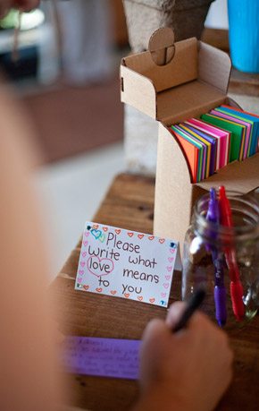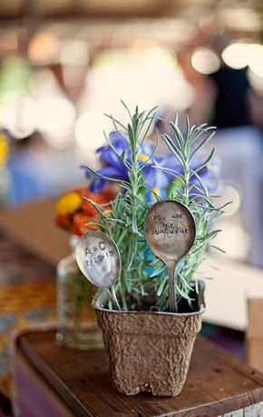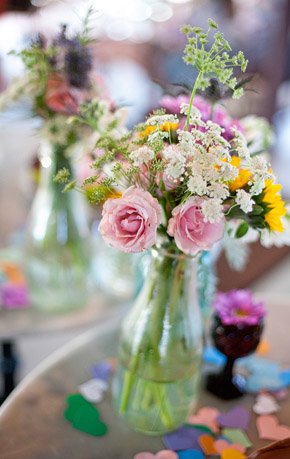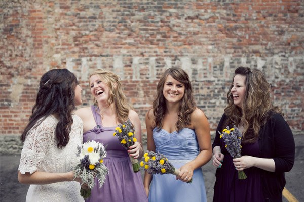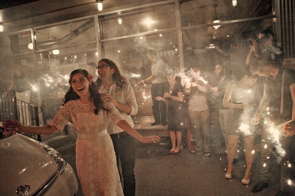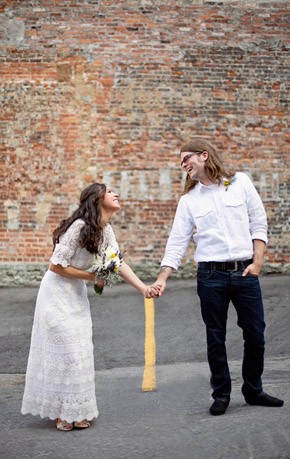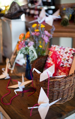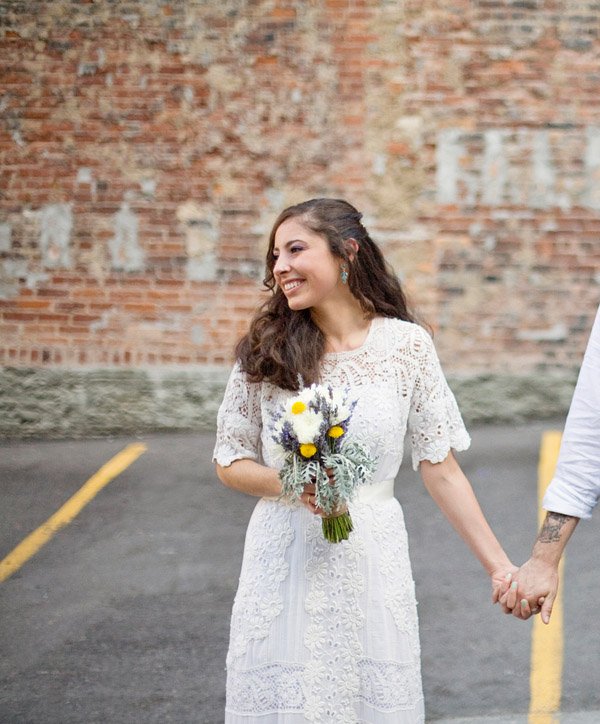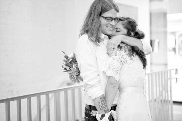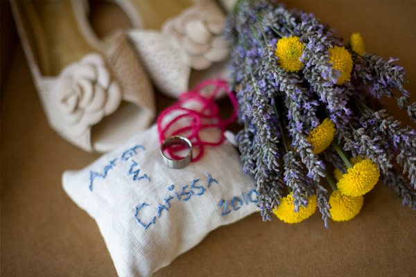 La boda de Carissa y Aaron es de esas bodas que tienen un encanto especial. Se aprecia enseguida que los novios se han implicado en ella desde el principio y que han cuidado cada detalle con mimo y dedicación. Es una de esas bodas artesanales, en las que se nota la mano creativa y el gusto por la sencillez. Querían organizar una boda realmente especial para sus familiares y amigos y que tuviera retazos de su personalidad. El lugar que eligieron para la celebración ya es de por sí original, ya que se casaron en una galería de Arte Contemporáneo y para la recepción y fiesta posterior se decidieron por un sencillo café local de comida francesa. Nunca hubiera dicho que el vestido de Carissa tiene más de 100 años de antigüedad, a mí particularmente me ha encantado, lo encuentro tan… ¡vintage! Los amigos también se implicaron en la boda y uno de ellos confeccionó más de 100 grullas de papel, que colgaron como decoración de la ceremonia. Llenaron el espacio con montones de flores silvestres que colocaron en botellitas de cristal y con diversos elementos decorativos artesanales como las guirnaldas de colores confeccionadas con papel para magdalenas o el confetti con forma de corazón. ¿Os habéis fijado en la sencillez del pastel de boda? Una pajarita hecha con lavanda, el toque rústico ideal. Otro detalle artesano que me ha parecido muy bonito es el cojín de los anillos, me recuerda las labores que hacía en el colegio cuando era pequeña y también a esos saquitos rellenos de lavanda para dar olor a la ropa de los armarios. Definitivamente, la boda de Carissa y Aaron es una de esas bodas para el recuerdo…
