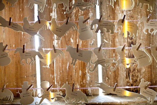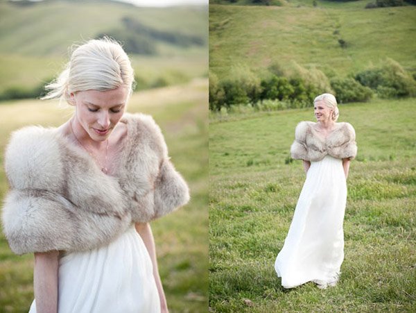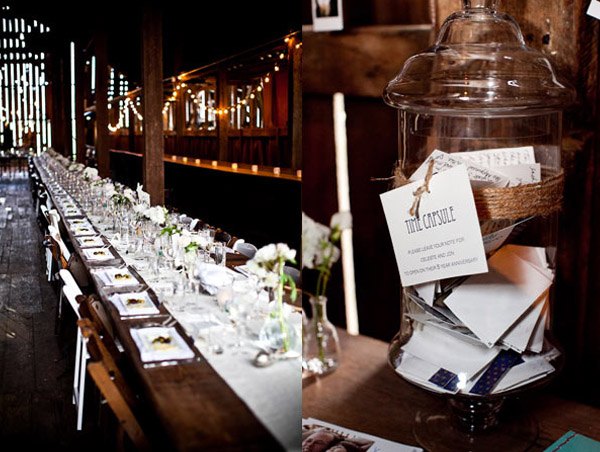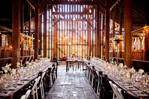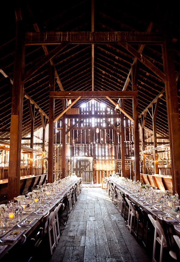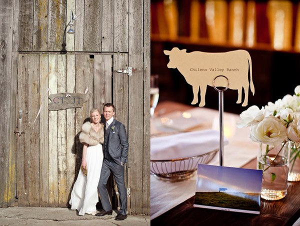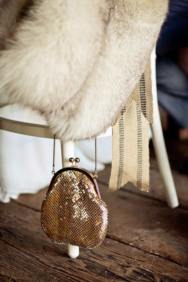 Me gustan los contrastes, el juego de mezclar lo antiguo con lo nuevo, lo clásico con lo moderno o lo básico con lo innecesario. Seguro que muchos no entenderán que en un espacio como un rancho se pueda celebrar una boda con glamour, pero eso precisamente es lo que se propusieron Celeste y Jon y lo lograron con nota, como podréis comprobar en las fotografías. Las bodas en el interior de un rancho tienen un encanto especial y suelen resultar económicas porque no es necesario gastar mucho en la decoración. El ambiente rústico hace posible, por ejemplo, que no sean indispensables los manteles para vestir las mesas, un sencillo camino de mesa acompañado de unas pequeñas velas ya puede ser suficiente. Otro aspecto con el que se puede jugar es con la iluminación, durante el día es precioso el efecto de la luz que se deja entrever a través de los huecos de la madera desgastada por el paso del tiempo y, por la noche, basta con colocar en el techo varias tiras de bombillas para conseguir un efecto más festivo. Pero dejando a un lado la decoración del espacio, en este caso lo que más me ha llamado la atención es el estilismo de la novia, en el que curiosamente no es el vestido el protagonista, sino los complementos. Esa maravillosa estola de visón junto con el bolso de lentejuelas doradas es quizás lo que le da al ambiente esa nota de glamour. Y de nuevo el contraste, el estilo de saber combinar esos dos elementos tan sofisticados con la simplicidad del peinado, un sencillo recogido bajo sin ningún tipo de broche o accesorio innecesario. ¿No os parece perfecto?
