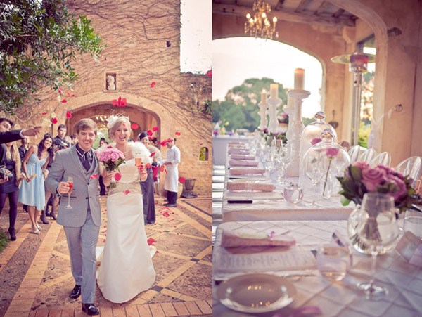 La boda de Ebony y Brendan es una de esas bodas que enamora desde el primer momento, por su diseño, su tonalidad y sus cuidados detalles. Se trata de una boda íntima de tan sólo 30 invitados celebrada en un lugar de ensueño, un pequeño y hermoso hotel de corte francés con acogedoras chimeneas, paredes de polvo malva, piedra centenaria y un exuberante jardín. Un trocito de novela sacada de un cuento de hadas. La decoración se inspiró en la paleta de colores pastel de Ladurée, la famosa casa francesa de pastelería especializada en macarons, los tonos malvas y el detalle de las rayas verticales fueron el referente de color, aunque también se jugó con el blanco y el negro, presente en un ajedrez gigante que sirvió, además de para ilustrar el reportaje fotográfico, para amenizar la espera de los invitados durante la sesión de fotos. Los novios descubrieron este paraíso durante un fin de semana de San Valentín, la novia había visto allí el vídeo The Ladurée Dream, acompañado de la música de Tchaikovsky Nutcraker Suite Sugar Plum Fairy y pensó que ese sería también su sueño, por ese motivo contrataron un trío de cuerda que tocó la misma música durante la ceremonia. Me gusta especialmente la combinación entre el toque clásico y el chic francés, el contraste entre el diseño rústico y moderno reflejado en el minimalismo de la silla Louis Ghost de Philippe Starck, de la que la novia se enamoró perdidamente y que supo combinar a la perfección con las impresionantes arañas del techo, de más de 300 años de antigüedad. Una boda para soñar…