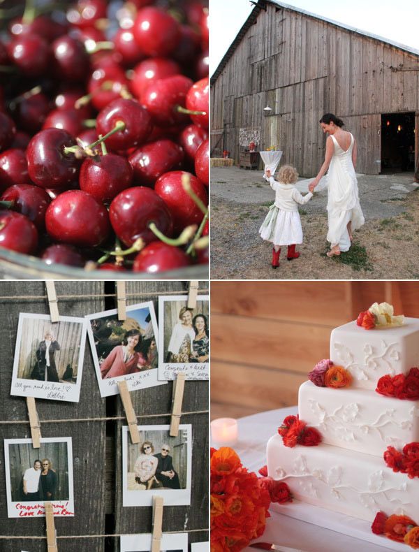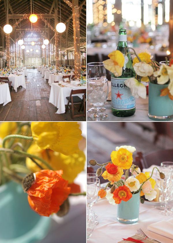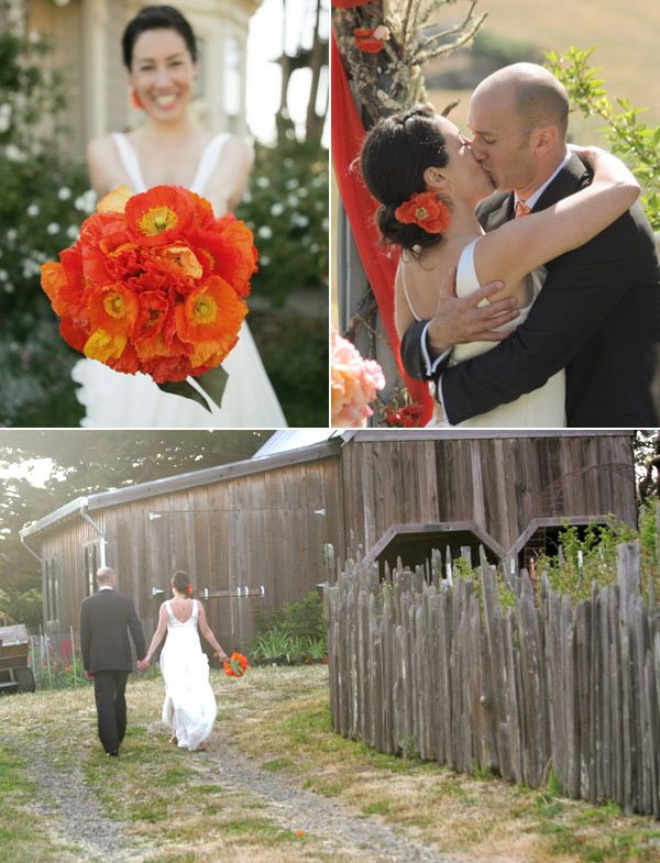 Eulalia y Paul se casaron en Petaluma (California), en el Chileno Valley Ranch, un lugar en pleno campo que ofrecía muchas posibilidades decorativas y visuales, como el huerto de manzanas orgánicas situado en el jardín de la granja. Un total de 600 hectáreas de pastos, colinas, arroyos y bosques, que dieron a su boda el aspecto rústico que buscaban. Cabe destacar el granero de madera, en cuyo interior se celebró el almuerzo, muy frecuente en las bodas americanas y nada usual en las españolas. Ya sois varias las que me habéis preguntado si conozco alguno que se alquile en nuestro país, pero todavía no lo he encontrado y la verdad es que sería un buen negocio para quien dispusiera de uno, así que si algún propietario lee este post ya lo sabe… Me ha gustado mucho el ramo y el tocado de flores de amapola de la novia, también presentes en el centro de mesa, creo que le da un aire silvestre que pega muchísimo con el ambiente que han querido transmitir los novios en su boda. Las fotografías respiran un ambiente relajado, fresco, puro y muy natural. La verdad es que cuando se vive rodeado de tanta polución, prisas y estrés, se agradece el poder cerrar los ojos y pensar por un momento en la llegada de la primavera y en sus campos de amapola.