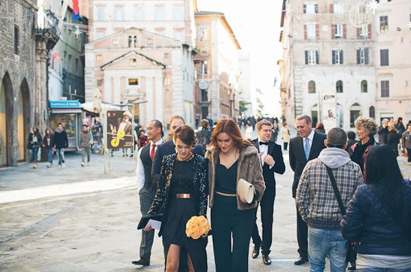 Si hay un país europeo similar al nuestro ese es Italia, por su clima, su gente, su arquitectura y su pasado histórico. La boda de hoy, celebrada en la ciudad medieval de Perugia, está inspirada en la elegancia y el glamour de la vieja Europa. Los novios no querían una boda al uso, más bien lo que buscaban era que sus invitados se sintieran como invitados a una cena especial y muy glamourosa, por eso Jemma huyó del típico vestido de novia y en su lugar, no pudo escoger mejor, lució un elegante vestido negro con una sobrefalda de quita y pon, una americana de paillettes del mismo color y un precioso cinturón dorado a juego con los zapatos. Realmente iba espectacular y el bouquet de rosas amarillas que acompañaba el conjunto daba el toque de color justo para la ocasión. El estilismo lo completaba un sencillo semirecogido lateral que daba a la novia un aire más distinguido y romántico. La ceremonia se celebró en el edificio del ayuntamiento, de estilo barroco, con arcos y columnas de piedra y una fachada que daba un sentido escenográfico a formas y volúmenes. Los clásicos Handel y Vivaldi estuvieron presentes en la música de la ceremonia, para dar paso unas horas después a la pieza que abrió el baile, Your Song de Elton John. Si hubo un recuerdo especial para los novios fue el romántico paseo que dieron tras la ceremonia, a pie por las calles de Perugia, recibiendo el cariño de sus habitantes mientras atardecía y la luz cada vez se iba haciendo más mágica. Un paseo que ocupará siempre un lugar especial en sus corazones, igual que las palabras ‘Tanti auguri!’ que no dejaron de escuchar durante toda la tarde y que quedarán siempre en su memoria en recuerdo de ese día único.
