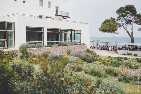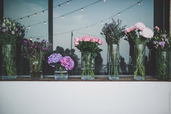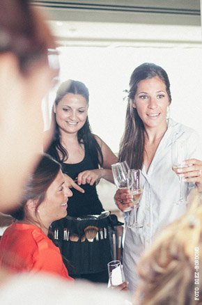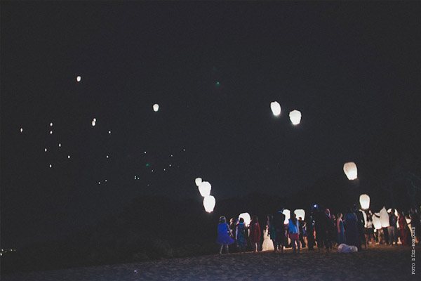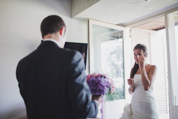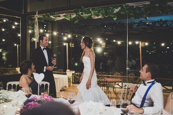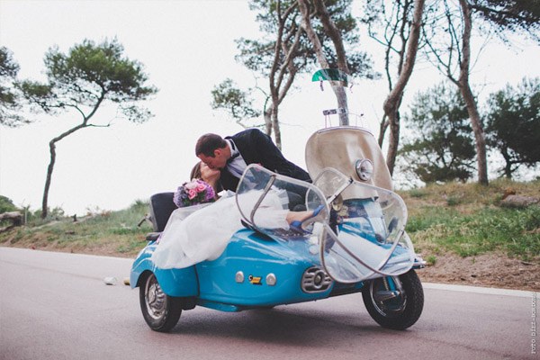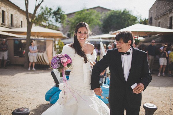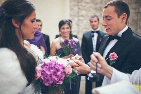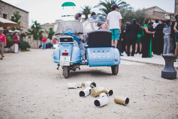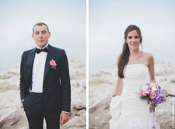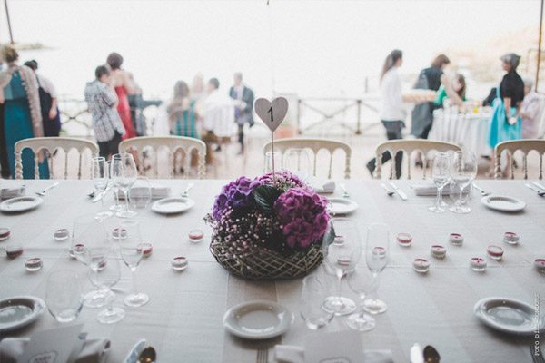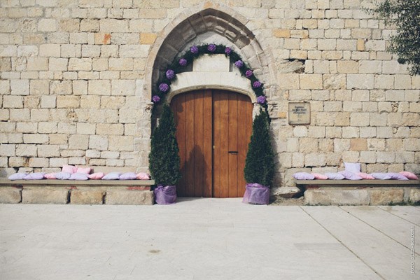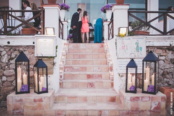 ¿Te imaginas estar en Nueva York con unos amigos y que tu pareja de repente desaparezca para escaparse a Tiffany a comprar un anillo de compromiso que más tarde te daría paseando por Central Park a bordo de un coche de caballos? Parece una escena de Sexo en Nueva York pero es lo que le sucedió a Sara, una novia afortunada con un novio muuuy romántico. Después de una pedida de estas características os podéis imaginar cuál fue su respuesta, ¿verdad? De vuelta a la realidad, la pareja empezó a planear su futura boda. Querían algo íntimo pero especial, un fin de semana con amigos en un lugar idílico de la Costa Brava y se decidieron por el Hostal Empúries, donde todos los invitados podían también alojarse. Confiaron plenamente en Wedding Senses, la empresa encargada de la organización de la boda y de la que ya os he hablado en alguna ocasión ya que capitaneándola está Greta, wedding planner y amiga. Podéis ver su propia boda en la sección de Bodas Bloggers y os recomiendo que le echéis un vistazo a su nueva web, que ha estrenado diseño hace muy poquito. Todos los detalles de la boda se cuidaron al máximo, los invitados llegaron al lugar de la ceremonia en un trenecito turístico típico de la zona pero el momento de impresión fue la llegada de la novia, a bordo de una Vespa azul de aire vintage con sidecar. Un coro góspel amenizó la ceremonia y durante el aperitivo también hubo música en directo. El color predominante en toda la decoración fue el violeta, presente tanto durante la ceremonia como en el banquete y todos los elementos se personalizaron al máximo, desde las invitaciones hasta los regalos para los invitados, unas preciosas macetas con jabones de Olivia y una bolsita de lavanda, que se encontraron al llegar a su habitación. No faltó un divertido photocall, una mesa de dulces y hasta una máquina de hacer palomitas y otra de algodón de azúcar. Pero el momento más íntimo y especial se vivió después de la cena y antes de la fiesta, cuando todos los invitados bajaron a la playa a pedir un deseo para los novios y lanzar un montón de farolillos voladores a orillas del mar, de fondo la banda sonora de Alegría del Cirque du Soleil les hizo protagonistas de uno de los momentos más emotivos de la boda.