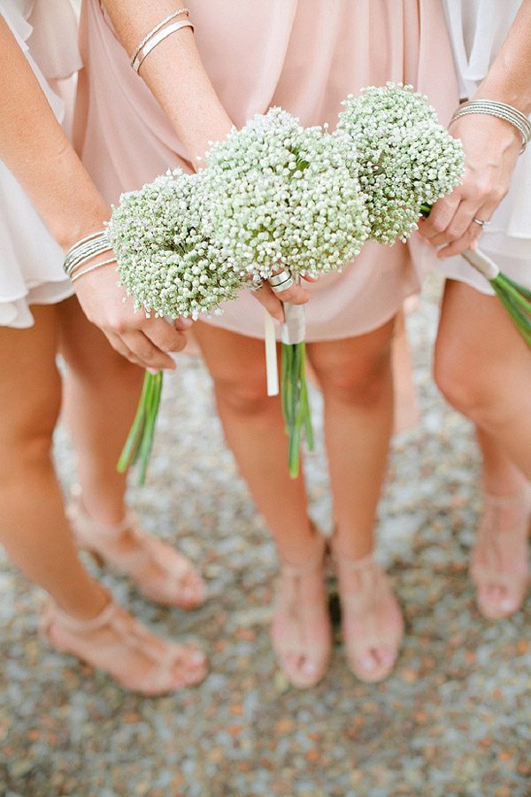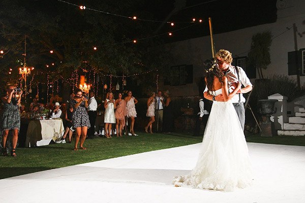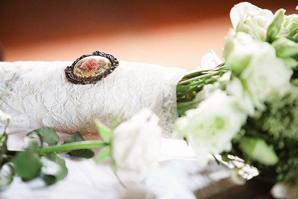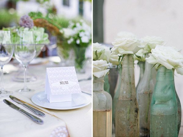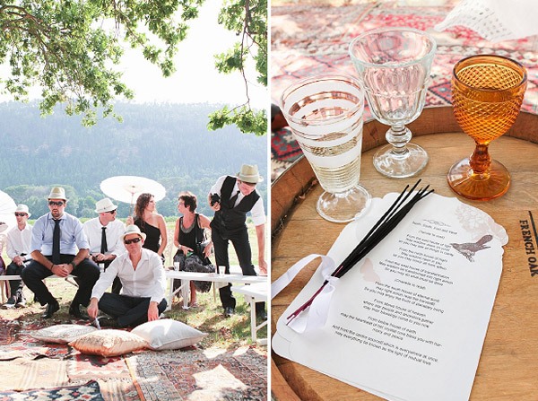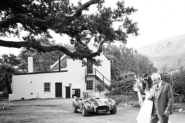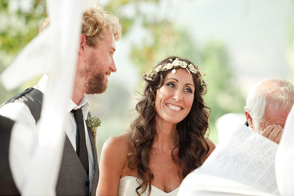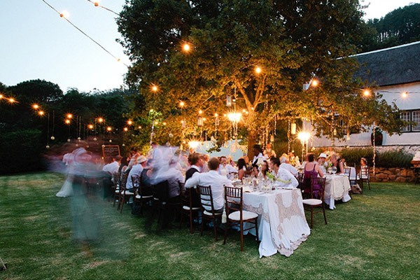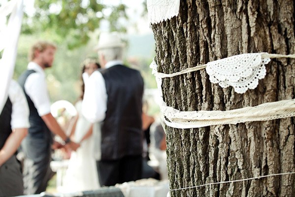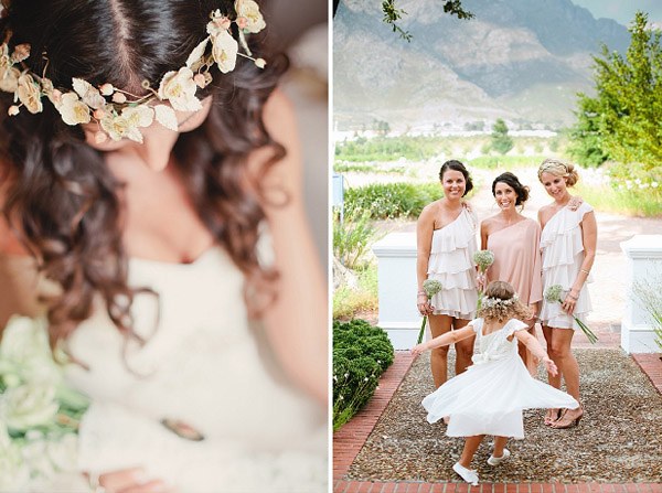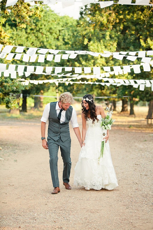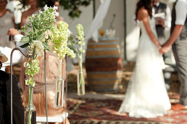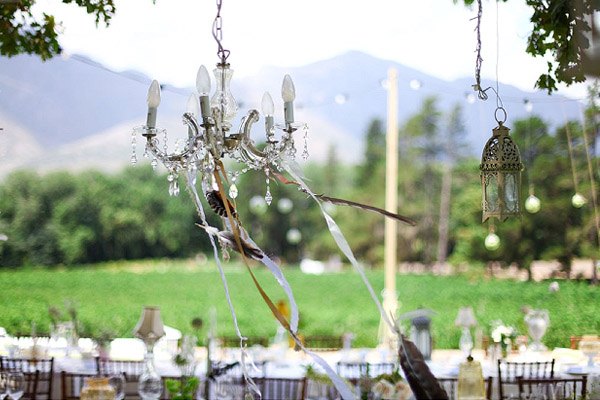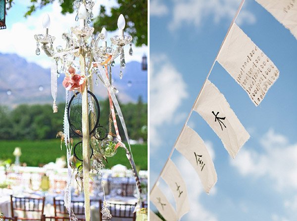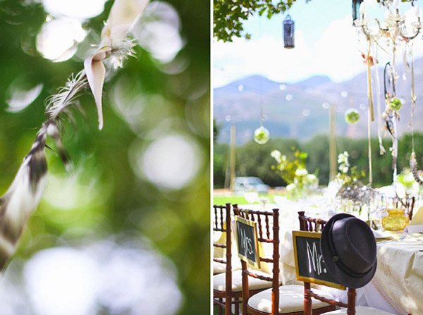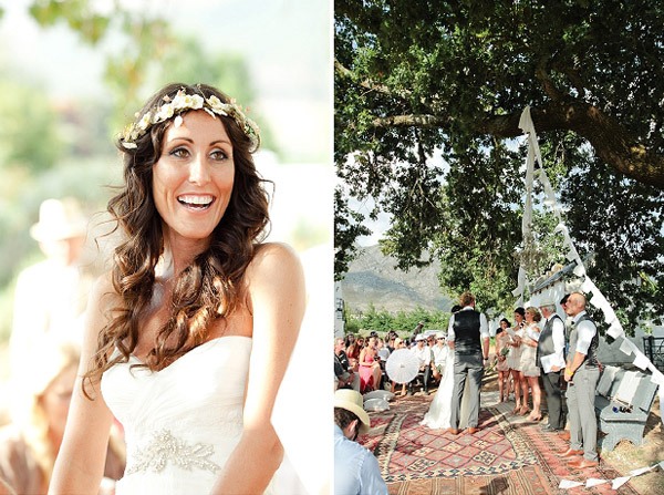 La boda de hoy podría tener muchos calificativos porque está plagada de detalles, el primero que me viene a la cabeza es el de boda bohemia, aunque también podría ser una boda hippy o quizás ecológica. En todo caso, sea cual sea el calificativo que la defina, he de deciros que es una de las bodas que más me han gustado últimamente por su amor por todo lo natural. Kelly y Natalie se conocían desde la escuela secundaria, aunque no empezaron a salir juntos hasta la fiesta del 21 cumpleaños de Kelly, desde entonces no se han separado ni un minuto y tras 11 años de relación y 8 de convivencia decidieron dar el paso y casarse. La propuesta de matrimonio de Kelly fue muy romántica ya que invitó a Natalie a pasar un fin de semana en la Granja Spide. Cuando ella llegó a la habitación se encontró con una cálida chimenea encendida y un pasillo iluminado con velas y rosas, de fondo, su canción favorita y una botella de champagne. Como es natural, no pudo resistirse. Los dos son unos amantes de la vida al aire libre por eso eligieron para casarse Rickety Bridge, una hermosa finca vinícola situada en Franschhoek Valley. El entorno no podía ser más idílico, con el viejo puente destartalado y unas fantásticas vistas a las montañas y a los viñedos. La ceremonia tuvo lugar bajo un enorme roble decorado con guirnaldas de ganchillo, símbolo de su amor por la tierra. Un pasillo de alfombras kilim y botellas de cristal con flores blancas en su interior, guiaban a los novios hasta un altar tipo hayma de aire oriental. La inspiración para la decoración la obtuvieron de sus numerosos viajes nada tradicionales y siempre diferentes, los dos creen en el poder y la belleza de la madre tierra y son unos apasionados de la cultura asiática, de ahí la presencia protagonista de bolas, candelabros, lámparas de cristal y farolillos de estilo árabe colgados a distintas alturas por todo el espacio. Me ha gustado el peinado elegido por la novia, pelo suelto y ligeramente rizado con una corona de flores como único adorno, es tan sencillo que incluso simplifica las líneas del vestido de encaje. Y de nuevo la presencia de la paniculata en los ramos de las damas de honor, me encanta. La mantelería de hilo bordado, los cubiertos antiguos plateados y los centros de mesa florales ponen el broche de exquisitez a una boda marcada por la belleza de lo natural.