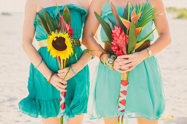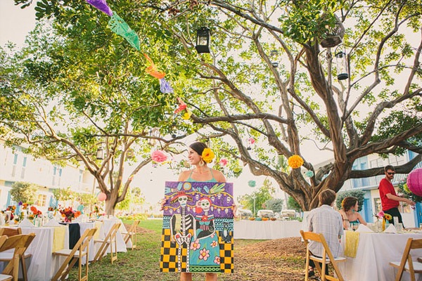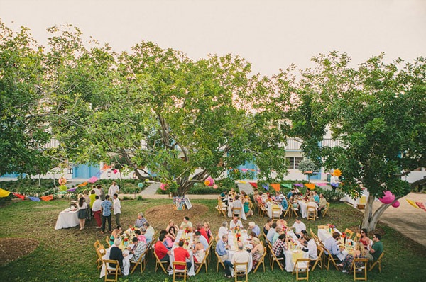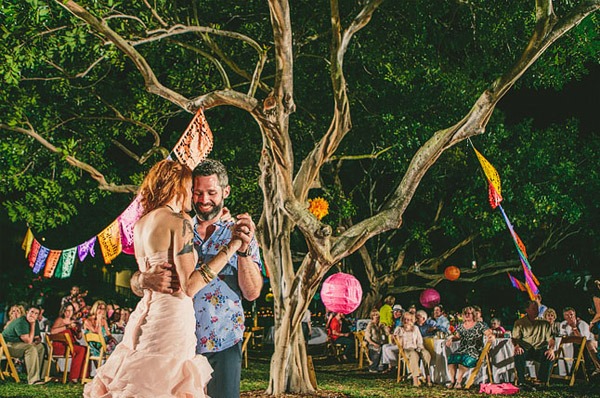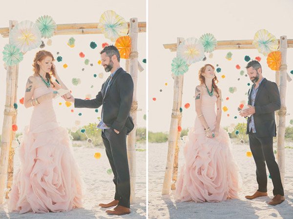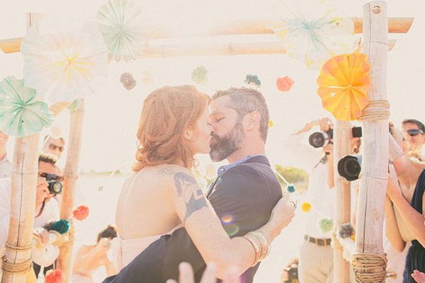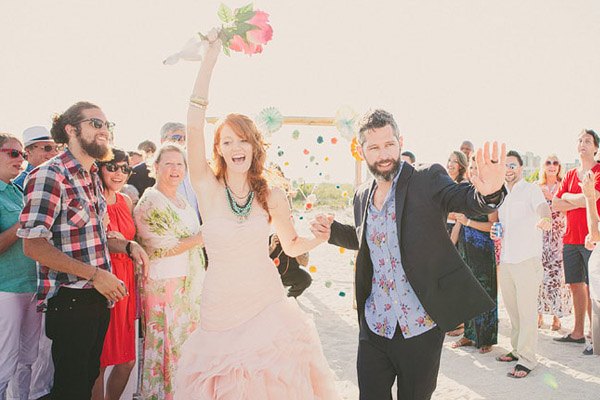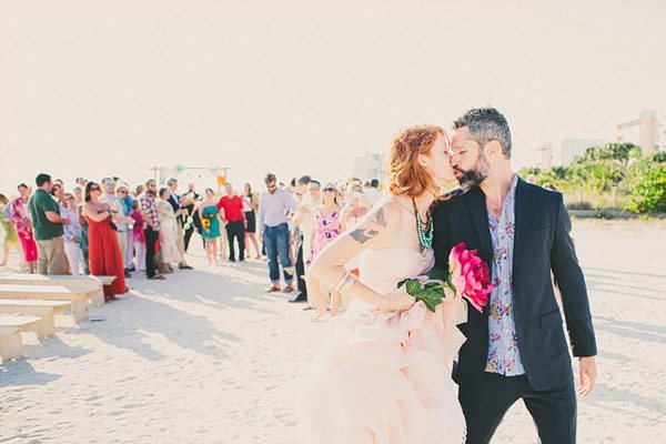 Ayer empezó el verano y ha sido como si alguien hubiera abierto de repente la caja del calor, las temperaturas han subido y yo no puedo dejar de pensar en arena, mar y sol, así que en el post de hoy nos vamos de boda nada más y nada menos que a Florida Beach. Varias cosas han llamado mi atención pero me gusta especialmente el colorido, tanto de la boda como de las imágenes plasmadas por el fotógrafo, ya que ha sabido darle ese aire a calima de verano que suele respirarse en las bodas junto al mar. Los novios querían colores brillantes que evocasen una temática de ambiente mexicano, por lo que se recorrieron innumerables tiendas de antigüedades y mercadillos de segunda mano en busca de toda la decoración: tarjetas postales de época, sombreros mexicanos, guirnaldas, banderines, jarrones, velas… Pero lo más divertido fue la implicación de todos los familiares y amigos de los novios. Muchas veces no pedimos ayuda, bien porque creemos que podremos llevar todo nosotros solos o bien por no molestar, y eso es un error porque precisamente lo que hizo especial la boda de Kendrick y David fue la implicación de los invitados, fue una auténtica boda DIY. De la decoración de la ceremonia se encargó un amigo de la pareja y cargó con ella en un avión recorriendo medio país hasta llegar al lugar de la celebración. La música la puso el hermano de David a través de un divertido radiocasette estéreo portátil de color rosa, todos colaboraron en colgar los pompones, los farolillos y las guirnaldas que decoraban todo el espacio, además de las flores de distintos colores que previamente se había encargado de comprar la madre de la novia, hasta el maquillaje y la peluquería corrió a cargo de unas amigas de Kendrick. Eso fue lo que hizo realmente especial la boda. Eso y el contar con un buen fotógrafo porque, como bien dijo la novia, todo pasa tan rápido ese día que al final el pastel se acaba, la decoración desaparece, las flores se marchitan… pero siempre quedan las imágenes que son las que ayudarán a recordar un día tan especial.