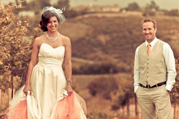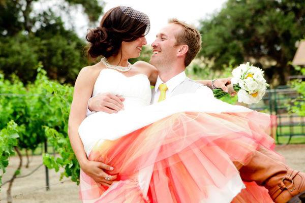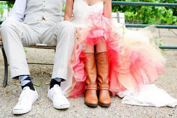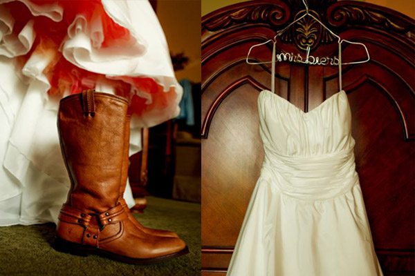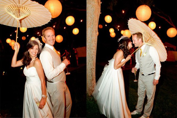 La boda de Lori y Justin se celebró en una finca privada, en California. Desde el principio tuvieron claro que querían dar a su enlace un aire campero y todos los detalles se cuidaron al máximo. Lo primero que atrajo mi atención fue el increíble vestido de la novia, con esa tela de tul de color rojo que le da un aire cabaretero que recuerda a esas bailarinas de Saloon tejano. Las botas camperas ayudan a acentuar todavía más ese punto campestre, además de dar un toque de desenfado al vestido. Y lo que me parece súper curioso es la mezcla de contrastes entre el tocado birdcage y las botas camperas, nunca hubiera imaginado una combinación así y la verdad es que no sólo no me desagrada sino que la encuentro muy original. Aunque en cuestión de contrastes el novio también contribuye con su mezcla de bambas blancas y calcetines a rombos, ¿no creéis? Para la decoración, de ambiente rústico, utilizaron sillas de madera pintadas de blanco y pequeñas lucecitas en la zona de la cena, que se sustituyeron por lámparas chinas en la zona del baile. Y aunque a última hora cayeron cuatro gotas, todo estaba previsto y la lluvia no fue un impedimento gracias a los originales parasoles de papel de arroz con los que se cubrieron novios e invitados. Sencillamente genial…