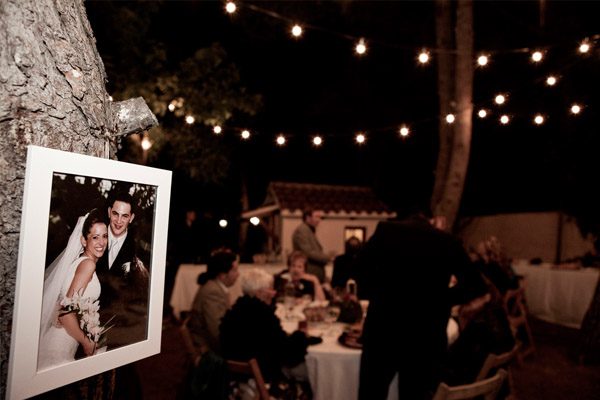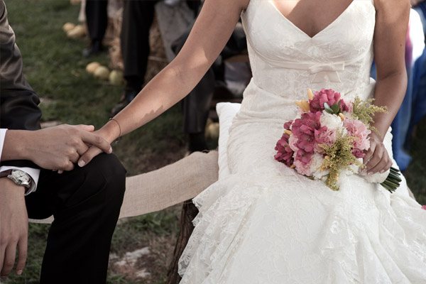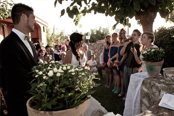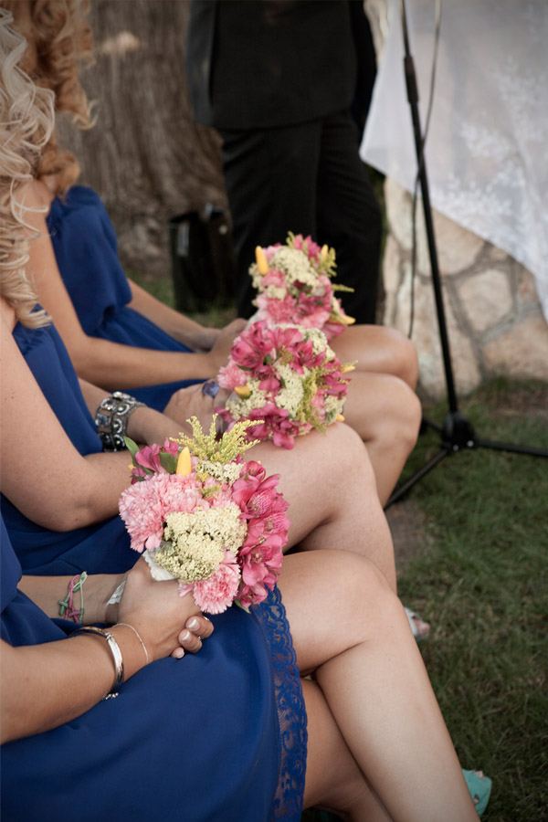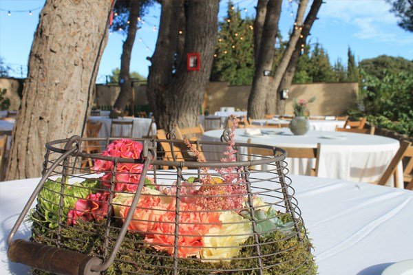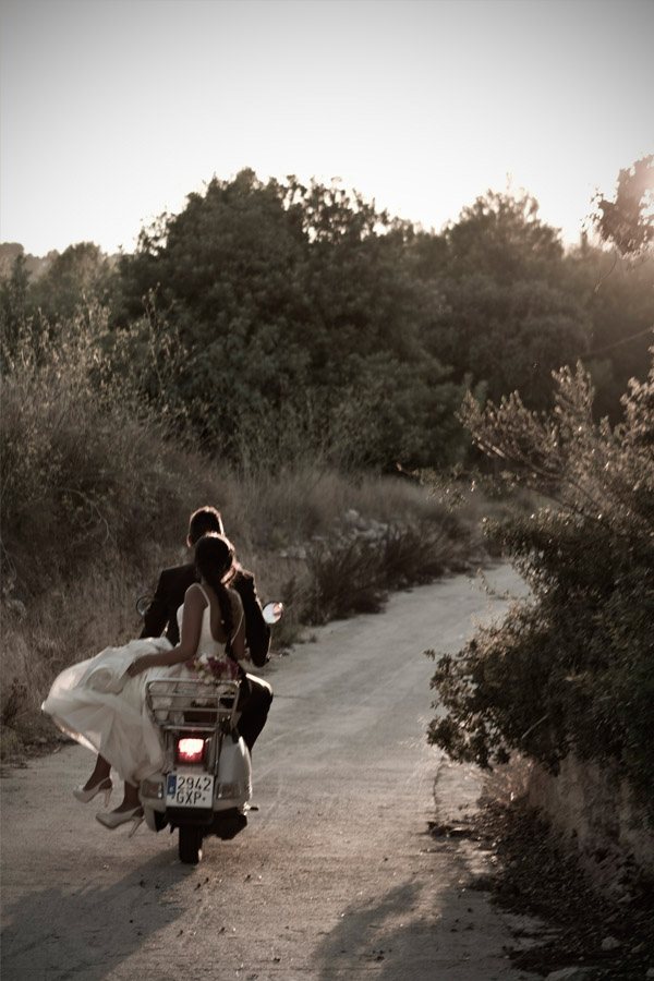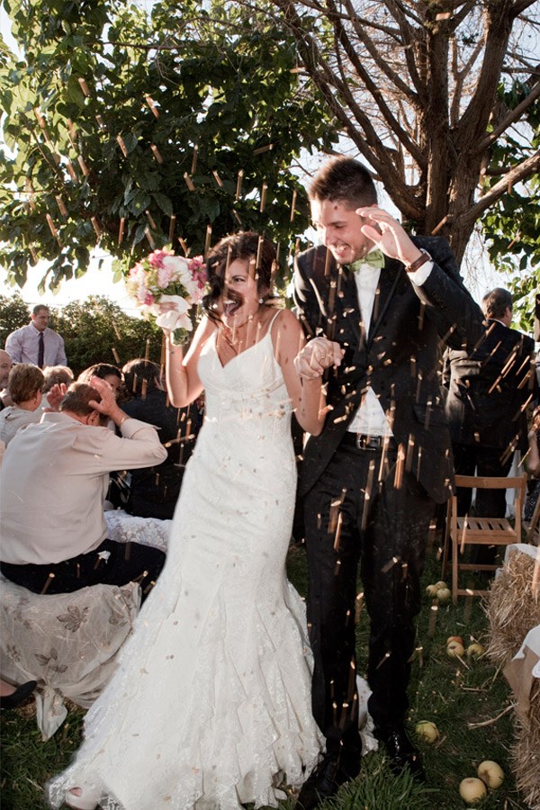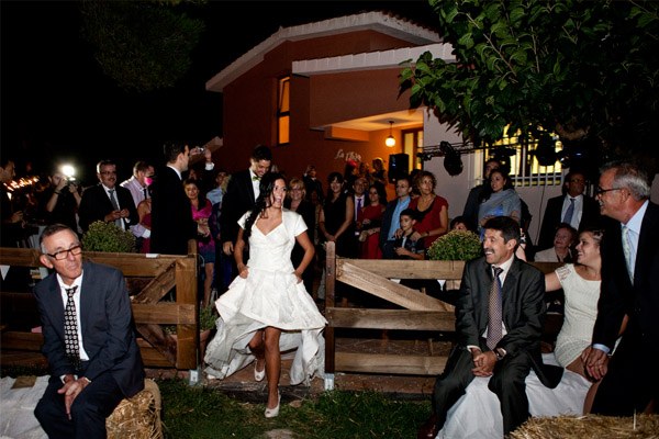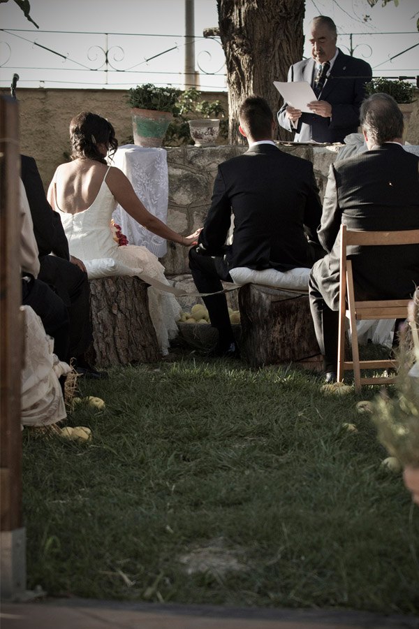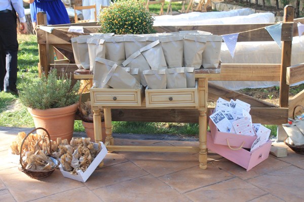 La boda de Noa y Álvaro es una de esas bodas familiares, caseras y por ello, muy auténticas. Una boda al aire libre, celebrada en el jardín de su propia casa, junto a su huerto, su gallinero y sus animalitos. Detalles en los que Karen, la wedding planner de Bodas Deluxe, se basó para desarrollar toda la decoración. Hubo más de un protagonista en la boda, los primeros los novios como es lógico pero también sus perros Otto y Stich, que no quisieron perderse el acontecimiento y se vistieron para la ocasión luciendo sendas pajaritas. También destacaron las mejores amigas de Noa, sus damas de honor, luciendo el mismo vestido combinado con distintos complementos y con ramilletes a juego con el bouquet de la novia, un ramo de flores que no parecen flores, como quiso Noa y que Urban Plant supo interpretar a la perfección confeccionándolo con pequeños pimientos amarillos (paprika), solidago y plantas crasas, combinadas con otras flores más convencionales en diferentes tonos de rosa. El sobrino de Noa fue el encargado de llevar los anillos, colocados en un bastidor con tela de encaje rescatada de la tienda de telas que hace años había sido propiedad de la madre de la novia. A medida que los invitados iban llegando a la boda, se encontraban en la entrada de la ceremonia con un bodegón de pequeñas bolsitas de papel kraft que contenían maíz duro, del que usan los novios para alimentar a sus gallinas, para que los invitados se lo arrojaran al final de la ceremonia y un kit de supervivencia, el regalo que los novios habían preparado para sus invitados. También había unos pay-pay diseñados por los mismos novios que incluían por un lado un programa resumen de toda la boda, y por el otro un cruci-boda que los invitados tenían que resolver. Una vez resuelto salía una palabra, el primero en entregar su cruci-boda completo, con la palabra correcta, tenía premio. Éxito total tuvo el puesto de limonada, con dispensadores de estética vintage y pequeñas botellitas decoradas con blondas y cuerda rústica. La ceremonia se decoró con balas de paja cubiertas por telas, que también se utilizaron para decorar la fuente que hizo de altar, situada frente a unos troncos donde se sentaron los novios. Tras la ceremonia, los novios huyeron a bordo de su Vespa para hacerse unas fotos y al regresar se encontraron con un pequeño concierto sorpresa preparado por el grupo musical del primo de Noa, que hace versiones de los Beatles. Fue un momento muy especial. Tras la sorpresa tuvo lugar la cena-barbacoa en un pinar iluminado con guirnaldas de bombillas y decorado con fotos de boda de todos los invitados ya casados y de algunos miembros de la familia. Los centros de mesa siguieron la línea decorativa inicial, por lo que se confeccionaron con hueveras antiguas e incluso con cáscaras de huevo de las propias gallinas de los novios. Oh Fleurs! se encargó de toda la decoración floral realizando un trabajo espectacular. A la hora del baile los novios sorprendieron a todos realizando el playback de Mouline Rouge Elephant love medley, que habían traducido al español y grabado con sus propias voces. Y ya de madrugada, llegó la sorpresa final, una auténtica churrería entró en el jardín de Noa y Álvaro y se puso a hacer churros con chocolate para todos los invitados. La mejor manera de acabar una boda tan auténtica, ¿no os parece?