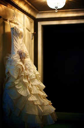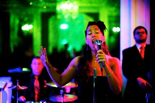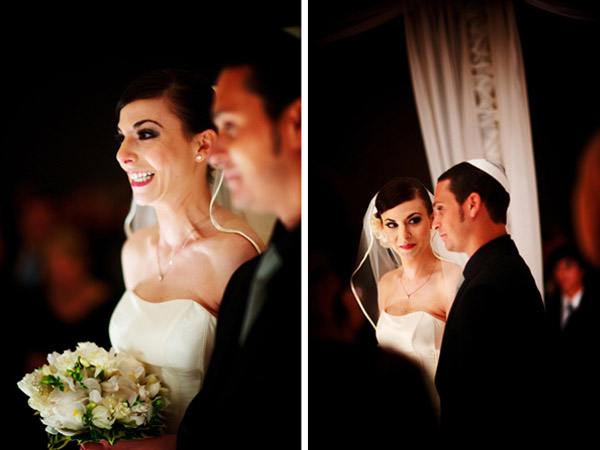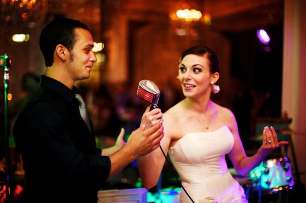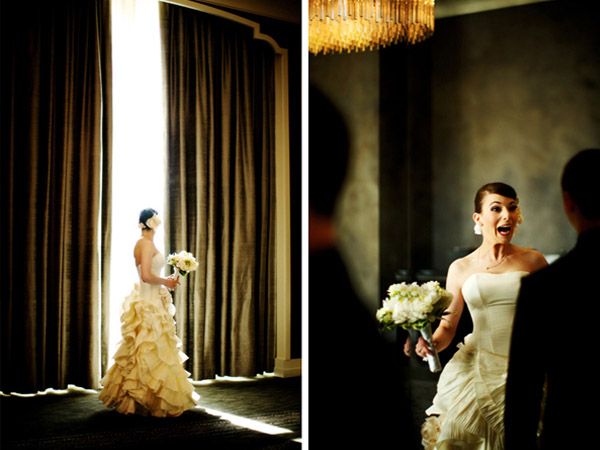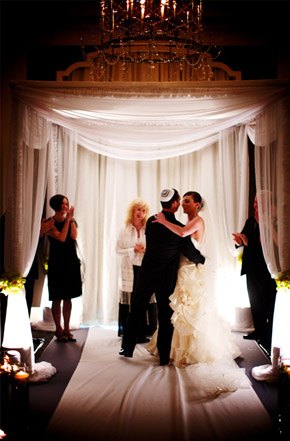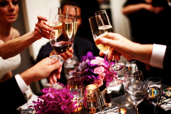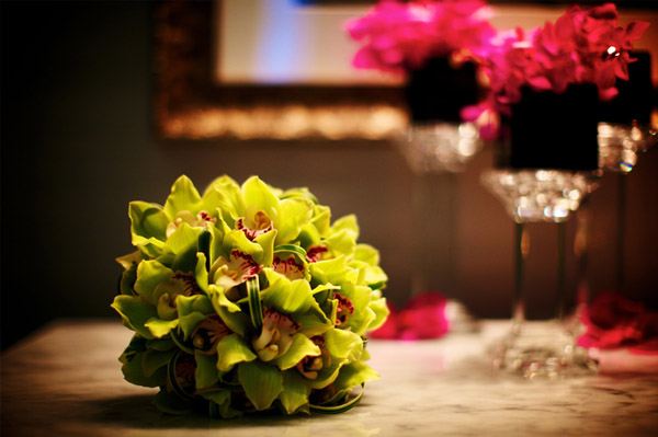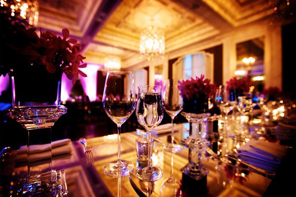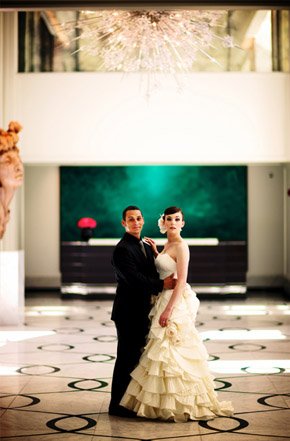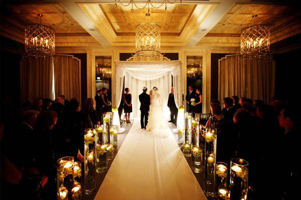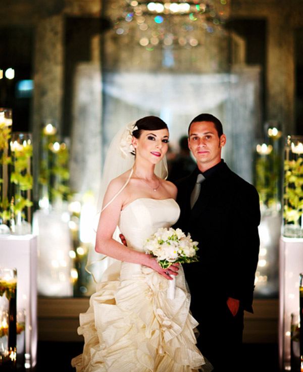 La semana pasada me llegó un correo de una seguidora, Almudena, por una parte nos felicitaba por el blog y por las ideas que en él encontraba para preparar su futura boda pero, por otra, me comentaba su desilusión al comprobar la escasez de información que existía en la mayoría de blogs sobre bodas de otoño-invierno, celebradas en hoteles de ciudad y en horario matinal. La verdad es que me quedé pensando en ello y vi que tenía razón, así que le prometí buscar una boda que cumpliese todos sus requisitos. Y aquí os la traigo, se trata de la boda de Samantha y Ben, celebrada en el Elysian Hotel de Chicago. La verdad es que una boda de hotel no tiene porqué ser muy diferente a una boda al aire libre, ya que la decoración se puede adaptar a las dimensiones de los salones y la fiesta puede ser igual de divertida, y aunque particularmente me gustan más las bodas de exterior, en según qué época del año está claro que no te puedes arriesgar. Samantha y Ben supieron aprovechar el espacio y dar un toque sofisticado a la decoración, centrándose principalmente en el menaje, combinándolo de forma muy acertada con los centros de mesa de cristal y flores en tonalidades liláceas. Para dar calidez a la sala optaron por la iluminación con velas. Me ha encantado la idea de enmarcar el pasillo de la ceremonia con jarrones de cristal de diversas alturas con velitas flotantes en su interior. ¡Queda precioso! ¿Y qué me decís de la lámpara de cristal del techo?… ESPECTACULAR. Otros detalles que destacaría son el ramo de orquídeas de la novia y el micrófono de aire vintage de la banda de música, un pequeño guiño a los 50. Ah! Me olvidaba comentar otra de las ventajas que tiene casarse en un hotel y es que al finalizar la fiesta sólo tienes que montarte en un ascensor para llegar a la habitación, donde seguro que os esperará alguna sorpresa más…