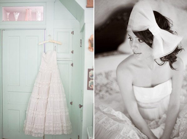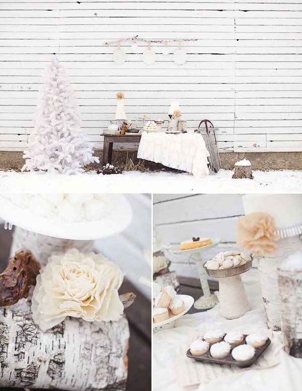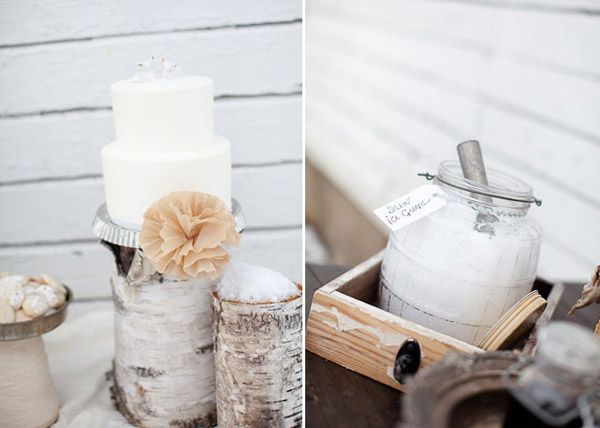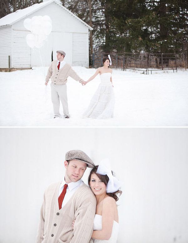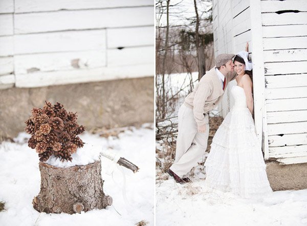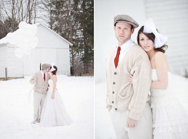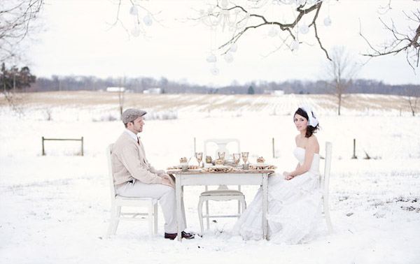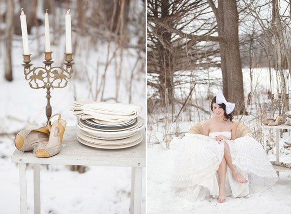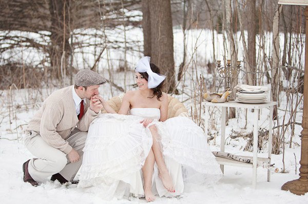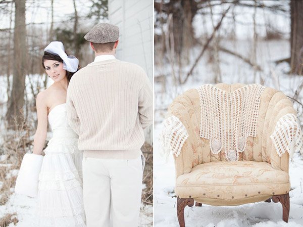 Ya os lo he comentado en más de una ocasión, soy una enamorada de las bodas de invierno y como parece que todavía tenemos invierno para rato, hoy os traigo otra boda de frío. Bueno, en realidad se trata de una sesión de fotos que describe lo que podría ser un estilismo de boda rústica en invierno. Lo primero que me llama la atención es el tocado de la novia, con ese gran lazo imposible que yo nunca hubiera sabido colocarme pero que ella luce de forma espectacular y que me encanta. La boina del novio también le da un toque rústico a su vestimenta aunque  para mi gusto no demasiado cuidada, creo que la chaqueta de punto no le acaba de favorecer.  En la decoración se ha jugado con tonos sencillos y neutros como los blancos, plata, dorados o crema, que tan bien combinan con el aspecto frío de las imágenes y digo frío porque hay alguna foto que más de un escalofrío me ha provocado. El toque vintage también está presente en la mayoría de escenas aunque yo destacaría tres: la de la habitación en tono azul velado con la lámpara sobre la gran cama de madera antigua, los zapatos con puntera de cuero de la novia y, sobre todo, el cubre-sillón de ganchillo, me encanta y además me recuerda muchísimo a las labores de mi abuela. Como ella siempre decía: todo vuelve. Y qué razón tenía…