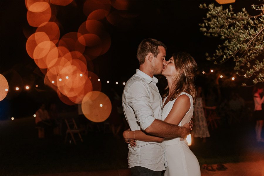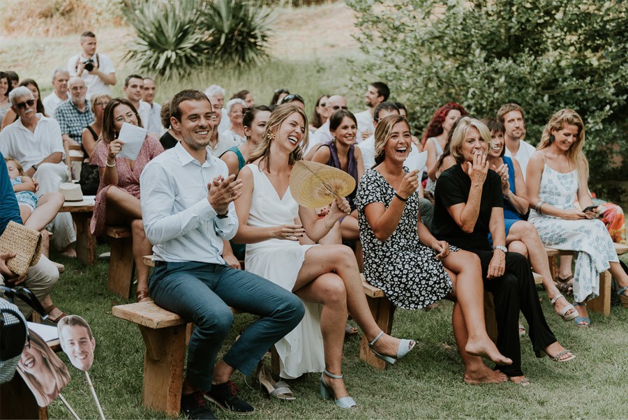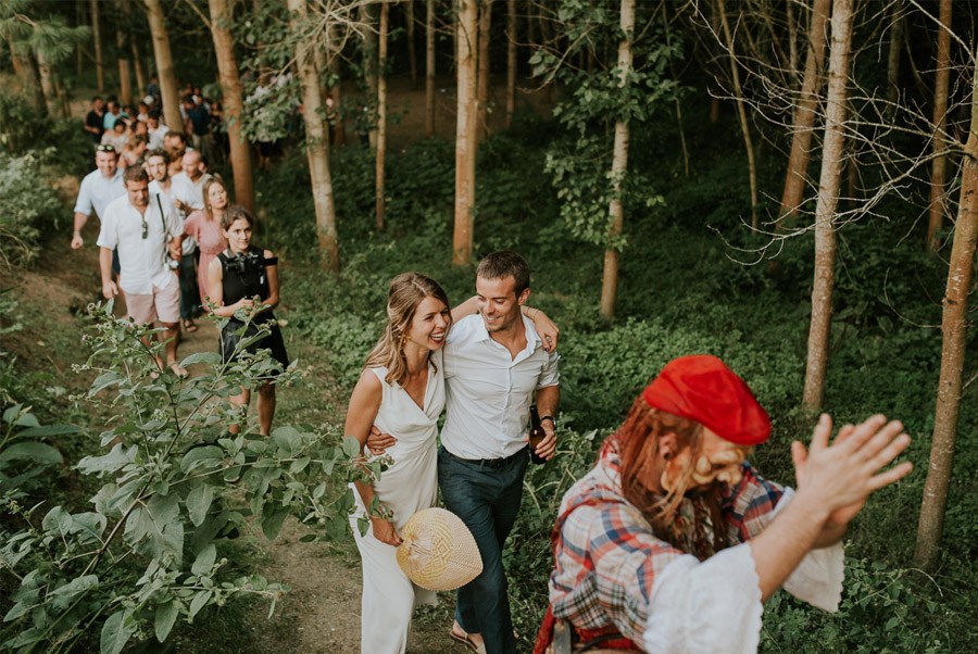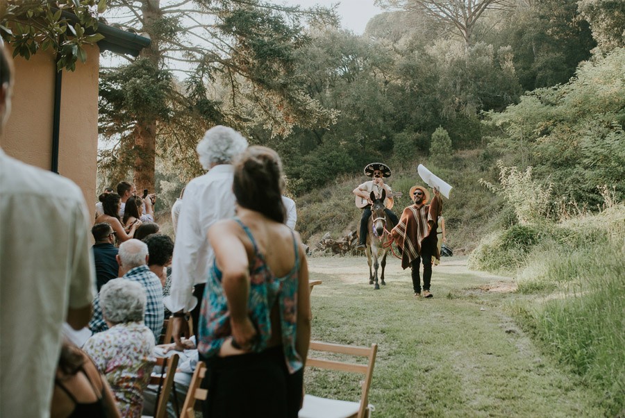 Entrañable, divertida, emotiva y sorprendente son los adjetivos que definen la no-boda de Elisabet y Albert y es que no podíamos empezar esta nueva temporada tras las vacaciones estivales con una boda mejor. Ver cada una de sus fotos es recordar el verano en el pueblo, ese de nuestra infancia que todos tenemos guardado en la retina y en el corazón, ese lugar especial en el que descubrimos y vivimos tantas cosas y que nos acompañó en nuestro paso de la infancia a la adolescencia y, que para los más afortunados, todavía sigue presente. Yo soy de estos últimos, cada verano, aunque sea por un corto espacio de tiempo, vuelvo al pequeño pueblecito que me vio crecer y que tanto me dio agosto tras agosto. Ahora lo disfruto de manera diferente pero con la misma intensidad e ilusión y se me sigue escapando una lagrimita cada vez que toca volver a la ciudad. Elisabet y Albert se conocieron así, en verano, organizando la fiesta mayor de su pueblo. Los dos siempre han estado muy vinculados a las actividades culturales que se organizaban, por eso cuando decidieron unir sus vidas, tuvieron claro que lo que realmente querían era montar su propia fiesta mayor, sin ceremonias de boda al uso ni nada por el estilo. Su boda tuvo hasta un pregón que recitaron desde el balcón de Can Riera de la Pineda, la preciosa casa que acogió su enlace y que fue el pistoletazo de salida a un día tremendamente especial y divertido. Ese fue uno de los momentos iniciales más emotivos, cuando los dos salieron juntos al balcón, emulando al alcalde y alcaldesa de su pueblo ficticio y pudieron decirles a todos sus familiares y amigos lo importantes que eran para ellos. Tras el pregón hubo paella, espectáculos culturales, una banda simulando un corre-bares, concierto en directo y DJ’s. El momento más divertido fue cuando pidieron a sus invitados que en vez de regalos les preparasen algún espectáculo breve y animado para amenizar la boda. Su sorpresa fue mayúscula cuando vieron lo preparados que venían todos, con instrumentos y disfraces incluidos. Pero el sorpresón final llegó cuando, acabados los espectáculos, empezó a sonar una ranchera y aparecieron dos amigos disfrazados de mejicanos, uno de ellos montado en un burro. No podían creérselo. Lo más fuerte es que no sólo trajeron el burro, sino también su documentación y se lo regalaron. Se quedaron atónitos, llorando de risa y aguantando el burro con su correa sin saber qué hacer. Fue el momento más loco del día, además no les dijeron que era mentira hasta al cabo de unas horas. ¡Cuando Albert ya había encontrado una hípica donde donar el burro! Justo después de los espectáculos, los novios quisieron devolver el regalo a sus invitados con una charanga que los acompañó por distintos rincones de la finca, donde hicieron paradas para beber cervezas y comer croquetas (la obsesión de Albert). La charanga Brass the gitano Band es precisamente la que cierra la fiesta mayor de su pueblo cada año, por lo que supuso otro guiño más para su propia fiesta. Tras comer, bailar, reír a carcajadas y disfrutar muchísimo, el punto final llegó con el momento del baile y es que tanto Albert como el padre de Elisabet son DJ’s en su tiempo libre y los dos han pinchado varios años en la fiesta mayor del pueblo, así que los novios pensaron que sería divertido hacer un duelo de DJ’s que bautizaron bajo el nombre de ‘Dos hombres con un mismo destino’. El ganador del duelo sería aquel a quien le lloviera más ropa interior por parte del público, una idea súper divertida que puso el broche final a un día lleno de amor y emociones. ¡Un día de auténtica fiesta mayor!