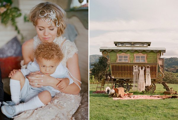 Lo que sucedió entre Erin y Jack tras su primera cita en Figaro, un acogedor bistró francés de Los Ángeles, fue amor a primera vista. Un año después, la fiesta de cumpleaños de Erin se convirtió por sorpresa en una fiesta de compromiso sin ella saberlo. Como cuenta Jack, ‘los dos somos muy dramáticos y cualquier excusa es buena para convertir una fiesta en una sesión de fotos’, no en vano él es modelo y actor y ella maquilladora. Cuando veáis el reportaje, seguro que pensaréis que más que una boda es un editorial para una revista de novias pero no, se trata de una boda auténtica y real, una boda de tres, ya que el único invitado fue Isaac, el hijo de la pareja de sólo dos años. Erin y Jack siempre habían pensado en una íntima boda/pic-nic y una vez tuvieron claros el fotógrafo y el organizador del evento, se pusieron manos a la obra. Fueron dando forma a la idea de boda que querían y en una reunión a alguien se le ocurrió la posibilidad de construir una réplica de una antigua caravana gitana. La caravana, acabó convirtiéndose en el eje central de la boda. Escogieron como escenario de lujo el Sunstone Vineyards, Winery & Villa, en Santa Ynez (California), una villa construida en su totalidad con antiguos materiales recuperados de humildes edificios y pequeñas aldeas francesas de la zona de Sunstone. La eligieron porque su estética, con su fachada de piedra caliza y sus detalles provenzales, les recordaba el primer viaje que hicieron con Isaac al sur de Francia. Ante la imposibilidad de decidirse por uno, Erin eligió dos vestidos de novia de dos grandes diseñadores Vera Wang para la ceremonia y Claire Pettibone para la tarde-noche. La ceremonia se celebró al aire libre, en los jardines, con unas vistas impresionantes como telón de fondo y amenizada por la música de Vincent & Vedan, un dúo gitano de guitarra y violín. El ambiente tenía ese aire entre bohemio y chic que la pareja quería conseguir. Al final de la tarde, Erin, Jack y su hijo Isaac se sentaron a los pies de la caravana a disfrutar de un delicioso pic-nic de pato asado, tartas de puerros y grosellas frescas. Fue un día realmente especial para los tres. Y para finalizar una velada de ensueño, la pareja se retiró a descansar a una de las cuatro suites de lujo de Sunstone, donde les esperaba un romántico y relajante baño a la luz de las velas. Seguro que cuando acabéis de ver las imágenes no podréis dejar de pensar en esa caravana…