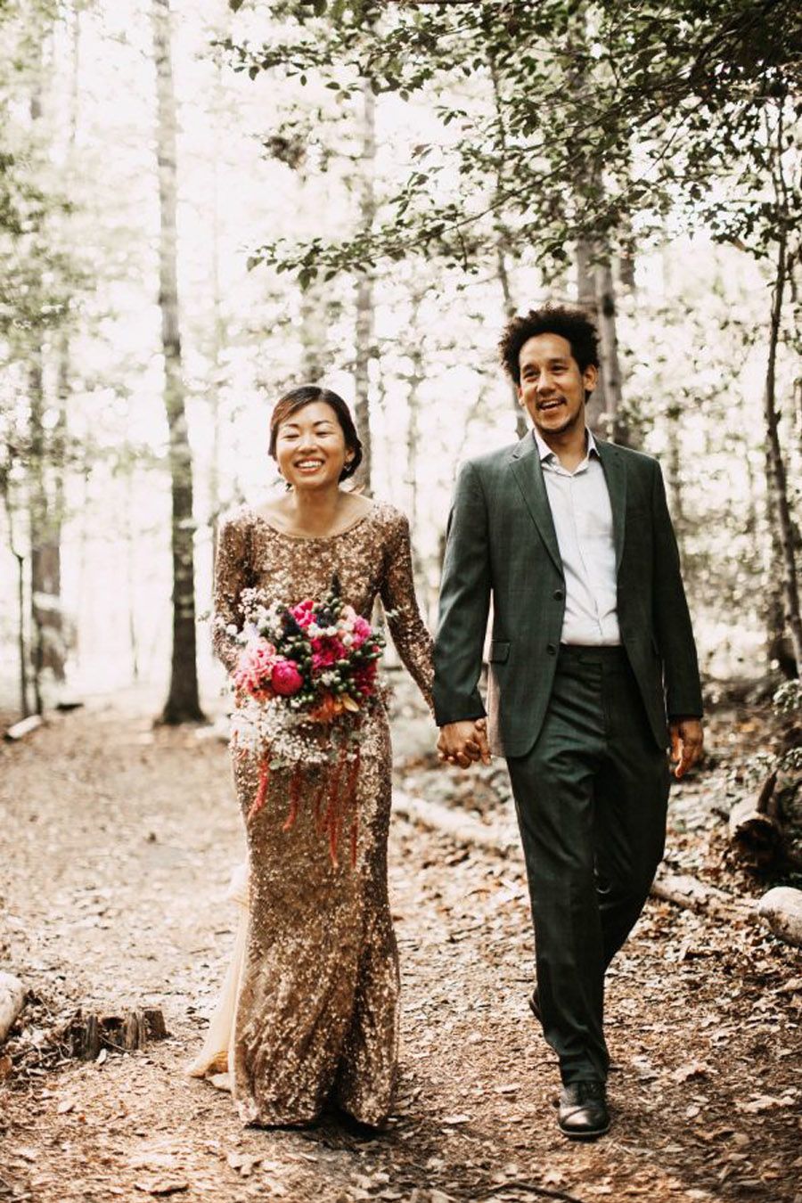 La boda de hoy es de esas bodas que respiran autenticidad por todos sus poros, de esas que tienen ese punto salvaje, de naturaleza pura, que te llevan a disfrutar cien por cien del entorno, de la familia y de los amigos, bodas que te hacen vibrar, sentirte libre y querido. Tanto Hannah como Tai tuvieron claro desde el principio que querían huir de cualquier convencionalismo e involucraron a todos sus invitados a participar en la boda, que se celebró en un antiguo campamento situado en el interior de un bosque. Querían una boda íntima y relajada, 100% hand made, en la que no tuvieran ningún proveedor externo ya que todos los enseres y decoración eran objetos cotidianos de los mismos novios o materiales que los invitados habían encontrado en el bosque, como el arco de la ceremonia, decorado por estos últimos con flores y ramas recién cortadas. La comida, las alianzas, la decoración, todo fue creado por ellos, lo que hizo que todos se sintieran especialmente partícipes durante toda la boda. Realmente se consiguió crear una comunión auténtica entre novios e invitados, convirtiéndolos también en protagonistas del día. Una complicidad que se refleja en varios momentos importantes de la boda como cuando, al finalizar la ceremonia en el bosque, todos los invitados se unen a los novios, descalzos, bajo las aguas de una cascada en un arroyo cercano. Sencillamente, espectacular!