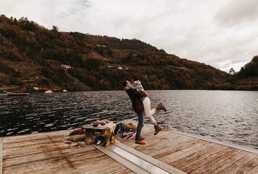 Seguro que cuando alguien piensa en Galicia, lo primero que se le viene a la cabeza es tradición, meigas, leyendas y un verde infinito que invade su alma y su paisaje. El editorial que hoy os presento es todo eso, un pequeño homenaje a la tierra y cultura gallega, cargado de simbolismos. Este año además es Año Santo Xacobeo, un año donde miles de peregrinos ponen rumbo a Santiago de Compostela a través del Camino de Santiago, un conjunto de rutas de peregrinación cristiana de origen medieval que se dirigen a la tumba de Santiago Apóstol. Este fue el telón de fondo sobre el que se asienta este precioso editorial. ‘O noso camiño’ bien puede ser el inicio de ese peregrinaje, como puede ser, el inicio de una nueva etapa en la vida de una pareja. Un camino que está cargado de muchos momentos, a veces felices, otras veces duros, de aprendizaje, constancia, superación y satisfacción. Mauro y Clara inician la aventura del Camino de Santiago para vivir una experiencia única. La experiencia del camino es difícil de explicar con palabras si no la has vivido antes. El camino te hace reflexionar sobre la vida, reconectar con la naturaleza, te ayuda a conocer en profundidad tu ser. En las etapas más duras aprendes a no rendirte, tener paciencia y perseverar. Y en las noches agradeces a tus pies que te hayan conseguido llevar tan lejos aún sin fuerzas. En las etapas fáciles puedes disfrutar de los pequeños placeres de la vida, como pueden ser una brisilla en la cara, el sonido del viento en las hojas, un rayo de sol, la compañía de los animales que encuentras durante el camino, la amabilidad de otros peregrinos que están viviendo la misma experiencia que tú. Qué similar a la vida y qué cercano al camino que emprende una pareja. Es durante el camino, cuando Mauro decide sorprender a Clara, pidiéndole matrimonio en Quinta Sacra, un lugar a la orilla del río Miño, en plena Ribeira Sacra, rodeado de viñedos que en otoño se tiñen de mil tonos diferentes de marrón, mostaza y verde. La pedida de mano se realizó mientras desayunaban en el embarcadero, con la consiguiente sorpresa de Clara. Mientras ellos continúan el camino por los senderos con su letrero de madera, en el que se puede leer, “Camiño xuntos”, realizado por Una casa en el Árbol, Dous Camiños, organizadora de boda, se desvía en la ruta hasta un mirador llamado “Miradoiro da lampa” que pertenece a la Asociación de Montes Comunales de Moura, para organizar y hacer todo el montaje de la ceremonia y el banquete. Se trata de una boda íntima donde se acercará la familia más allegada para poder hacer una celebración llena de esencia gallega. Entredecorados proporcionó todo el mobiliario tanto de la ceremonia, como de la zona de baile y banquete. Como menaje se utilizaron bajo platos rústicos de madera y cubertería de estilo vintage, acompañados de copas de cristal, de En 2detalles, además decoraban la mesa unas tazas con palabras gallegas de Vaidhe, como detalle para los invitados. Sobre la mesa nupcial se colocó una estructura de la que colgaban cestas antiguas, mucho verde y bombillas vintage de JBX, que también colgó lámparas en la zona de baile y bombillas preciosas en las estructuras de madera del banquete, para dar un ambiente más cálido y para recordar las típicas verbenas de los pueblos gallegos. Para el banquete se aprovecharon las mesas que había de merendero en el mirador, para no interferir ni dañar el espacio natural y se decoraron con unas estructuras de madera de donde colgaban adornos florales otoñales realizados por 1Beso y 1flor, que también se encargaron de la decoración floral de la ceremonia, en la que se usaron ramas de carballo para la estructura triangular donde se situaron Clara y Mauro de Boavista, la corona que se utilizó para el ritual de la ceremonia, el ramo de flores de Clara con lazos teñidos artesanalmente de Warm and Wild y la decoración floral de la zona de baile. El ritual de la ceremonia, que ofició María de Dous camiños, consistía en colgar de una corona de flor otoñal, los valores que los novios querían aportar al matrimonio. El diseño de los valores que se utilizaron durante la ceremonia, así como la invitación de la boda, sitting, seating plan y números de mesa fueron diseñados e ilustrados artesanalmente en papel de algodón por Dous camiños. En la zona de baile, decorada con lámparas y cajas de vino, alfombras y flores se ubicó el seating plan y la tarta nupcial hecha por Lydia García repostería, realizada en base de bizcocho de chocolate con una capa superior de chocolate crujiente y recubriendo el exterior de peras teñidas. Clara llevó un vestido de Sara Lage con tocado de Charo López Atelier y lucía pendientes y colgante de Boa peza, de su colección “Mi camino”, inspirada también en el camino de Santiago, al igual que las alianzas en las que estaban grabadas huellas de las botas de los peregrinos. Por otro lado Mauro vestía traje y chaleco de Iván Cross. Bioco fue la encargada de ponerlos muy guapos en maquillaje y peluquería. Para finalizar destacar los encargados de inmortalizar la experiencia, la fotógrafa Lara Onac y en vídeo Alejo videógrafo, que supieron captar en todo momento toda la magia del entorno y la increíble puesta en escena de un gran equipo de profesionales. ¡Espero que disfrutéis de este precioso trabajo!